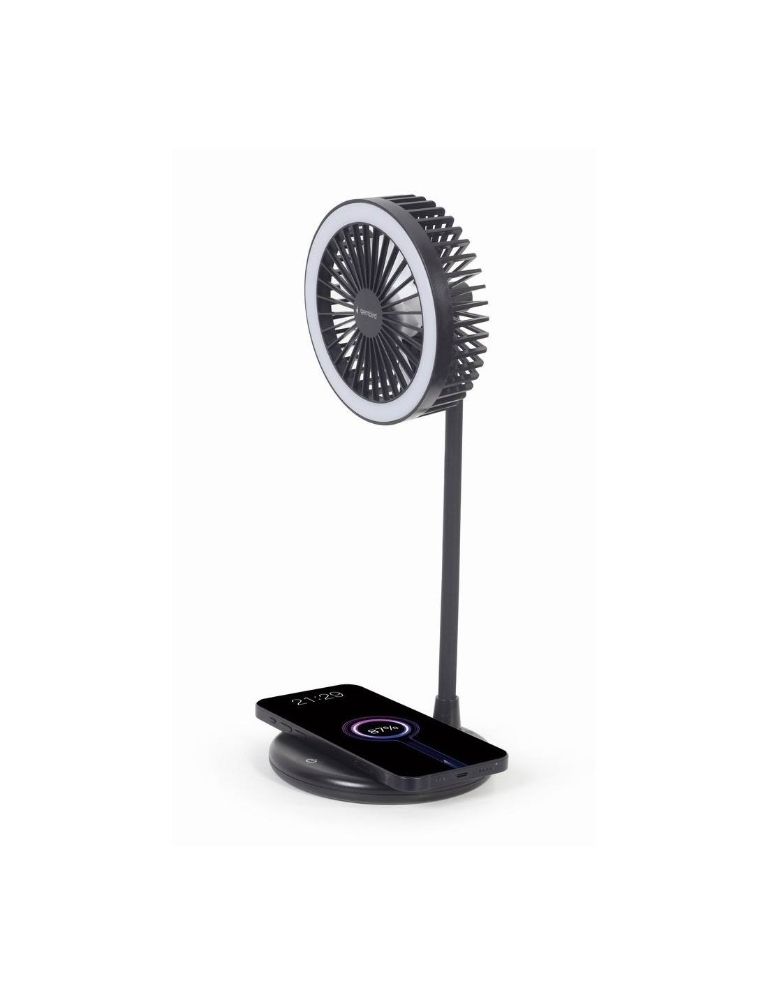 Gembird TA-WPC10-LEDFAN-01. Color del producto: Negro, Ubicación: Mesa, Nivel de ruido: 100 dB. Alimentación: CC, Consumo energético: 15,3 W, Voltaje de entrada AC: 5 V. Peso: 100 g. Ancho del paquete: 125 mm, Profundidad del paquete: 125 mm, Altura del paquete: 130 mm