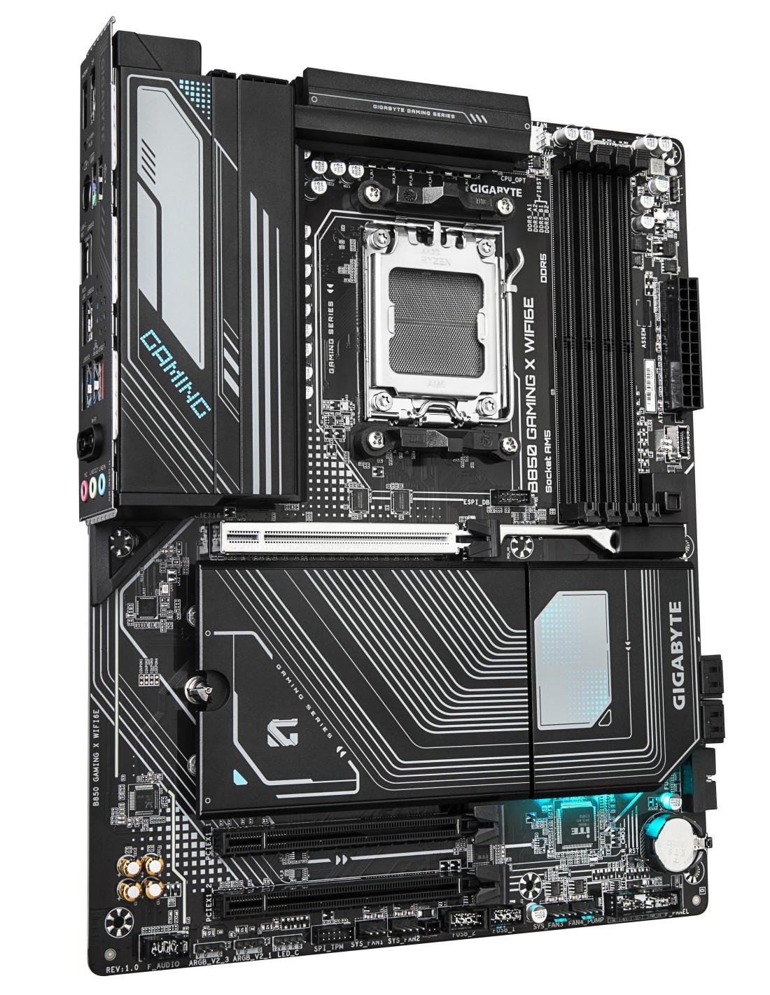 GIGABYTE B850 GAMING X WIFI6E Placa Base - Procesadores AMD Ryzen Serie 9000, VRM digital de 12+2+2 fases, hasta 8200MHz DDR5 (OC), 1xPCIe 5.0 + 2xPCIe 4.0 M.2, LAN 2.5G, WIFI 6E, USB 3.2 Gen 2x2. Fabricante de procesador: AMD, Socket de procesador: Zócalo AM5, Procesador compatible: AMD Ryzen 7000 Series, AMD Ryzen 8000 Series, AMD Ryzen 9000 Series. tipos de memoria compatibles: DDR5-SDRAM, Memoria interna máxima: 256 GB, Tipo de ranuras de memoria: DIMM. Interfaces de disco de almacenamiento soportados: M.2, SATA III, Tipos de unidades de almacenamiento admitidas: HDD & SSD, Niveles RAID: 0, 1, 10. Máxima resolución: 4096 x 2160 Pixeles. Tipo de interfaz ethernet: 2.5 Gigabit Ethernet, Estándar Wi-Fi: Wi-Fi 6E (802.11ax), Wi-Fi estándares: 802.11a, 802.11b, 802.11g, Wi-Fi 4 (802.11n), Wi-Fi 5 (802.11ac), Wi-Fi 6 (802.11ax), Wi-Fi 6E...
