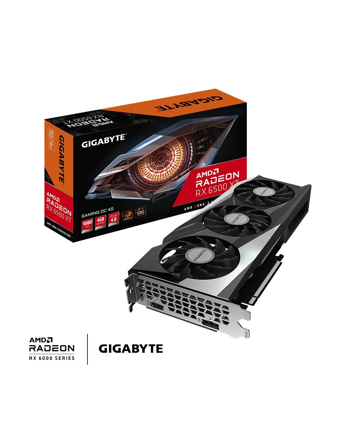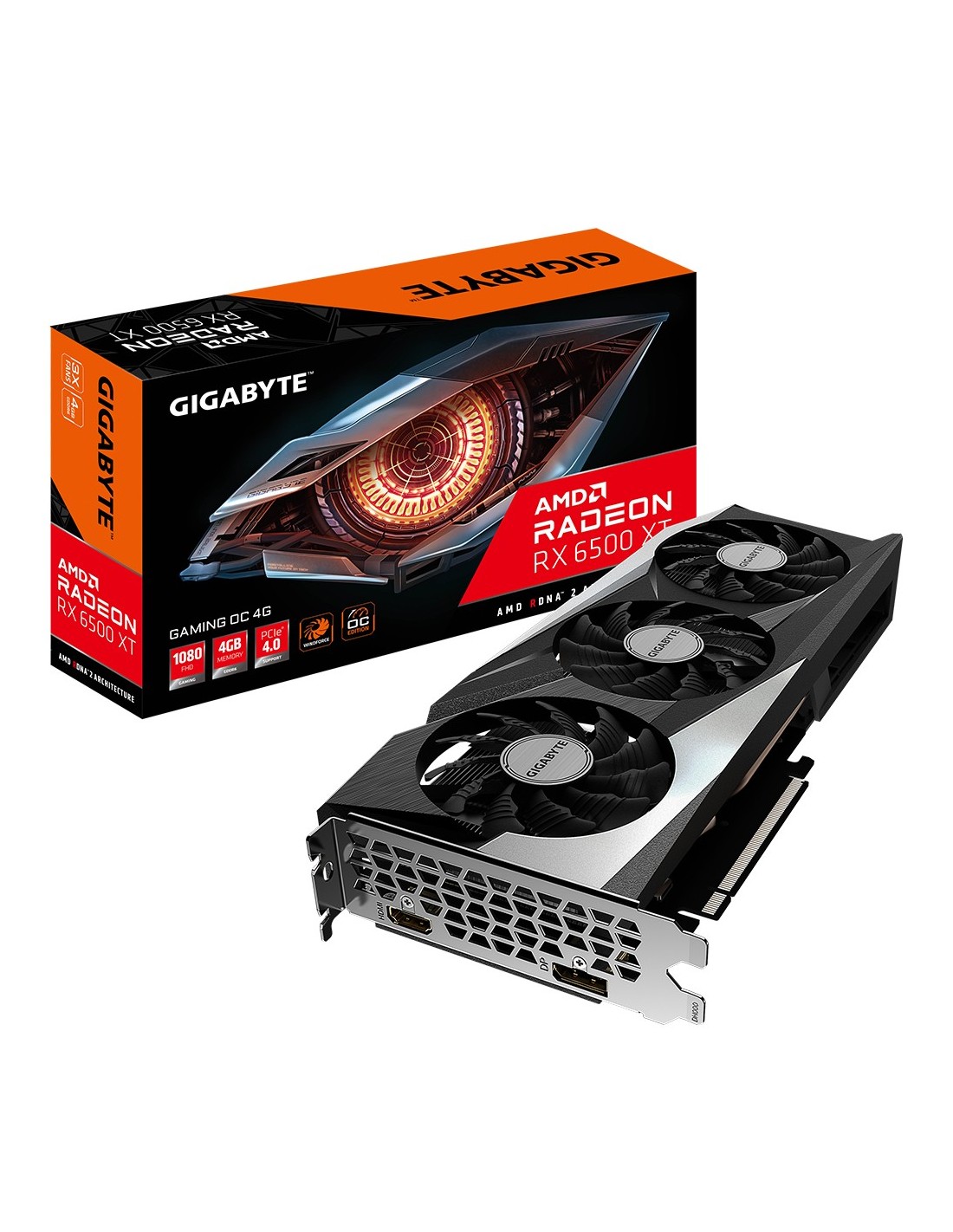 GIGABYTE GAMING Radeon RX 6500 XT OC 4G. Familia de procesadores de gráficos: AMD, Procesador gráfico: Radeon RX 6500 XT. Capacidad memoria de adaptador gráfico: 4 GB, Tipo de memoria de adaptador gráfico: GDDR6, Ancho de datos: 64 bit, Velocidad de memoria del reloj: 18000 MHz. Máxima resolución: 7680 x 4320 Pixeles. Versión DirectX: 12 Ultimate, Versión OpenGL: 4.6. Tipo de interfaz: PCI Express 4.0. Tipo de enfriamiento: Activo, Número de ventiladores: 3 Ventilador(es)