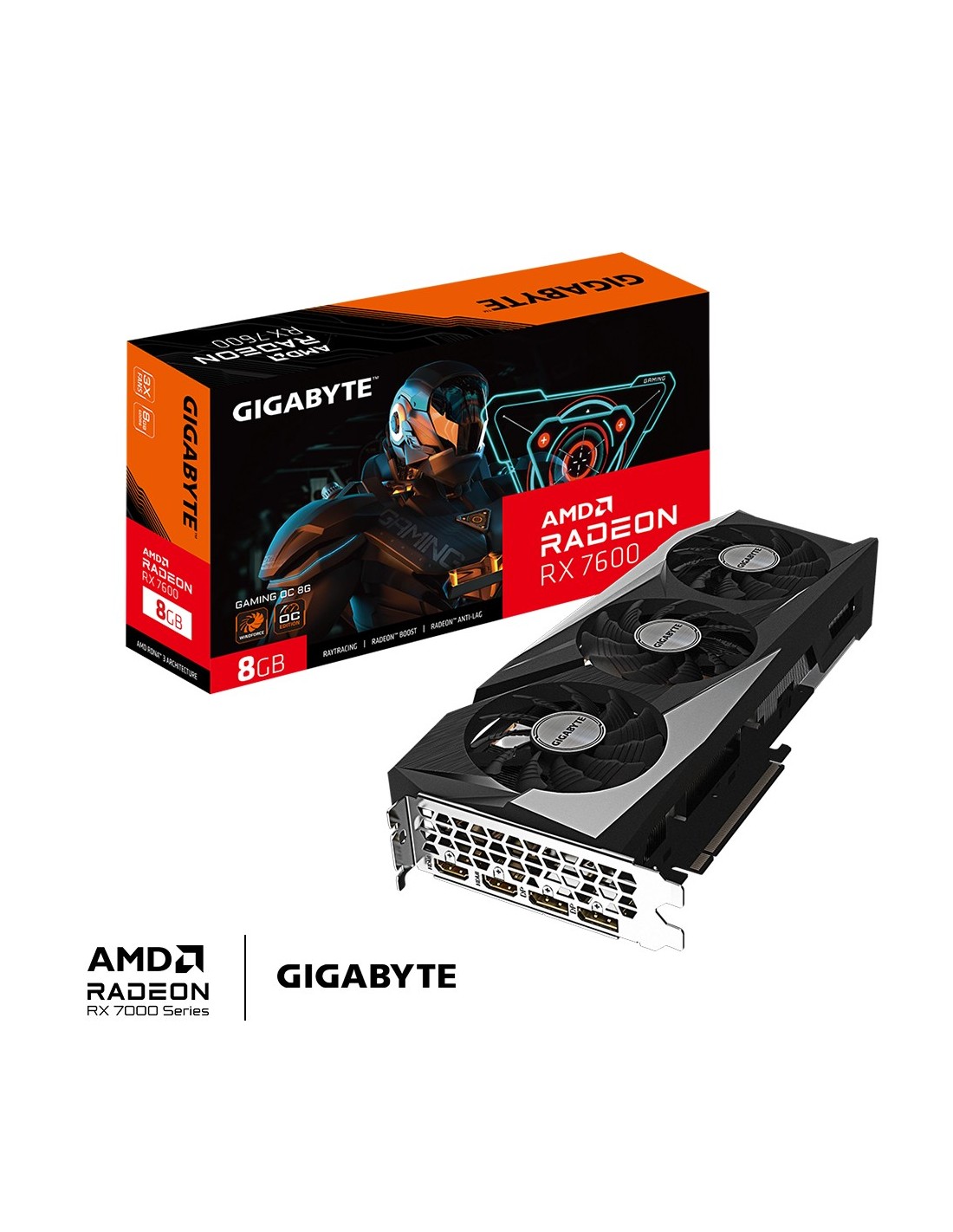 GIGABYTE GAMING Radeon RX 7600 OC 8G. Familia de procesadores de gráficos: AMD, Procesador gráfico: Radeon RX 7600, Frecuencia del procesador: 2355 MHz. Capacidad memoria de adaptador gráfico: 8 GB, Tipo de memoria de adaptador gráfico: GDDR6, Ancho de datos: 128 bit. Máxima resolución: 7680 x 4320 Pixeles. Versión DirectX: 12 Ultimate, Versión OpenGL: 4.6. Tipo de interfaz: PCI Express 4.0. Tipo de enfriamiento: Activo, Número de ventiladores: 3 Ventilador(es), Iluminación de color: Multi