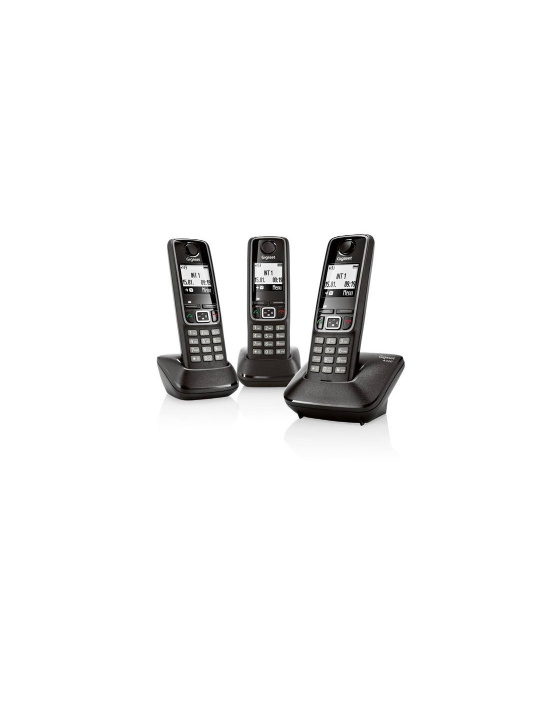 Gigaset A420 Trio. Tipo: Teléfono DECT/analógico. Altavoz. Rango máximo en interiores: 50 m, Rango máximo en exteriores: 300 m. Capacidad de lista de direcciones: 100 entradas. Identificador de llamadas. Diagonal de la pantalla: 4,57 cm (1.8"). Color del producto: Negro. Número de teléfonos móviles incluidos: 3