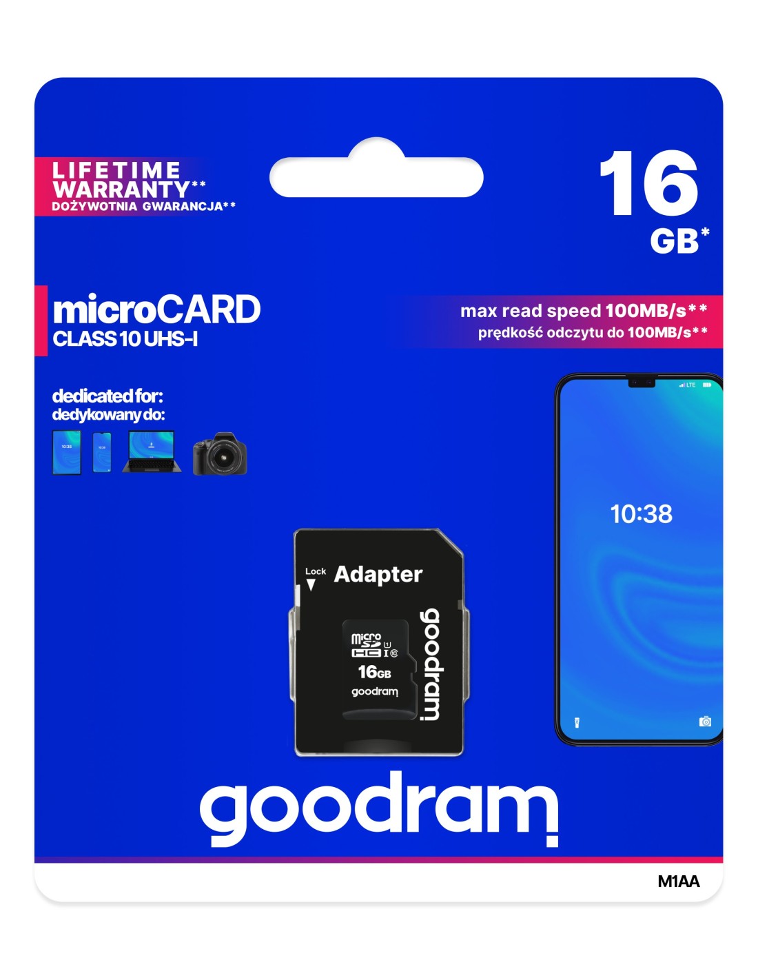 Goodram M1AA. Capacidad: 16 GB, Tipo de tarjeta flash: MicroSDHC, Clase de memoria flash: Clase 10, Tipo de memoria interna: UHS-I, Velocidad de lectura: 100 MB/s, Velocidad de escritura: 10 MB/s, Clase de velocidad UHS: Class 1 (U1). Funciones de protección: Protección contra campos magnéticos, Resistente a golpes, Resistente al agua, A prueba de rayos X, Color del producto: Negro