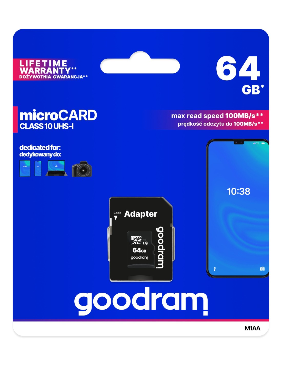 Goodram M1AA. Capacidad: 64 GB, Tipo de tarjeta flash: MicroSDXC, Clase de memoria flash: Clase 10, Tipo de memoria interna: UHS-I, Velocidad de lectura: 100 MB/s, Velocidad de escritura: 10 MB/s, Clase de velocidad UHS: Class 1 (U1). Funciones de protección: Protección contra campos magnéticos, Resistente a golpes, Resistente al agua, A prueba de rayos X, Color del producto: Negro