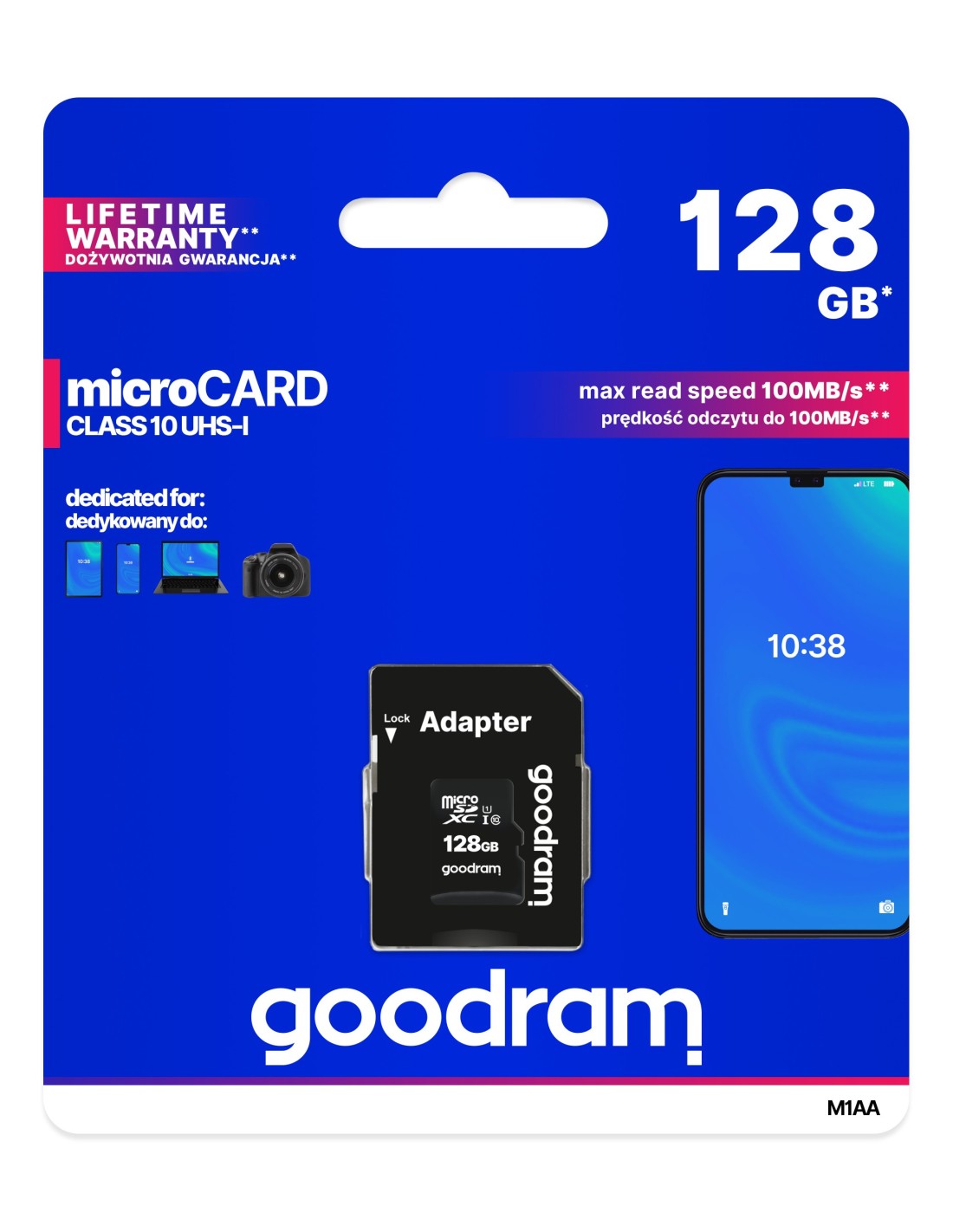Goodram M1AA. Capacidad: 128 GB, Tipo de tarjeta flash: MicroSDXC, Clase de memoria flash: Clase 10, Tipo de memoria interna: UHS-I, Velocidad de lectura: 100 MB/s, Velocidad de escritura: 10 MB/s, Clase de velocidad UHS: Class 1 (U1). Funciones de protección: Protección contra campos magnéticos, Resistente a golpes, Resistente al agua, A prueba de rayos X, Color del producto: Negro