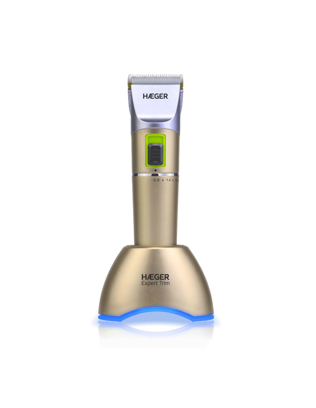 Haeger Expert Trim. Color del producto: Oro, Longitud mínima del cabello: 0,8 mm, Longitud máxima del cabello: 2 mm. Fuente de energía: Batería, Tiempo de funcionamiento: 180 min, Tipo de batería: Batería integrada. Tipo de peine: Fijo