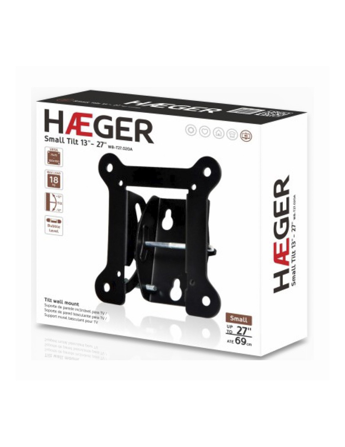 Haeger WB-T27.020A. Capacidad máxima de peso: 18 kg, Tamaño mínimo de pantalla: 33 cm (13"), Tamaño máximo de pantalla: 68,6 cm (27"), Compatibilidad con interfaz de montaje (min): 75 x 75 mm, Compatibilidad con interfaz de montaje (max): 100 x 100 mm. Ángulo de inclinación: -12 - 12°, Distancia a la pared (max): 3,3 cm. Color del producto: Negro