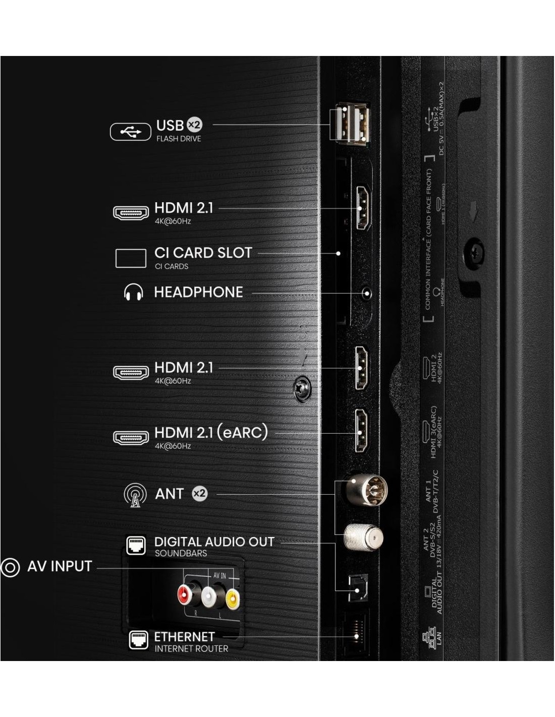 Hisense 50E77NQ. Diagonal de la pantalla: 127 cm (50"), Resolución de la pantalla: 3840 x 2160 Pixeles, Tipo HD: 4K Ultra HD, Tecnología de visualización: QLED, Forma de la pantalla: Plana, Tipo de retroiluminación LED: Direct-LED. Smart TV. Brillo de pantalla: 350 cd / m², Tiempo de respuesta: 8 ms, Razón de contraste (típica): 4000:1, Relación de aspecto nativa: 16:9. Formato de señal digital: DVB-C, DVB-S, DVB-S2, DVB-T, DVB-T2. Wifi. Color del producto: Negro