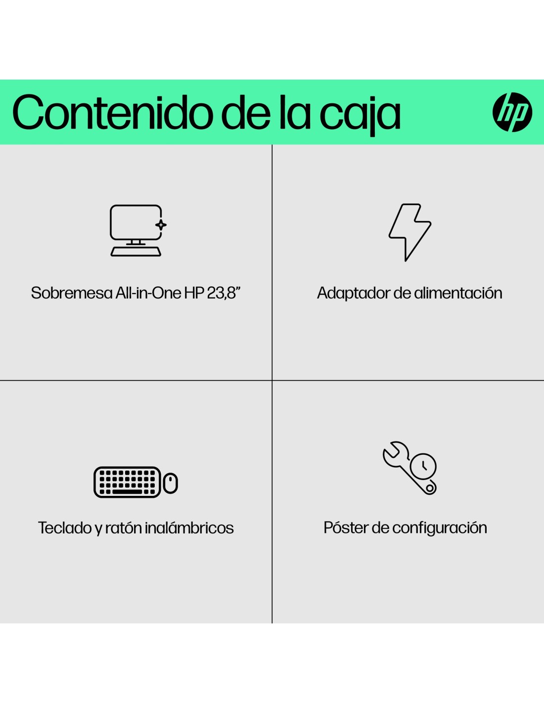 HP 24-cr0040ns. Tipo de producto: PC todo en uno. Diagonal de la pantalla: 60,5 cm (23.8"), Tipo HD: Full HD, Resolución de la pantalla: 1920 x 1080 Pixeles, Tipo de pantalla: IPS. Familia de procesador: Intel® Core™ i3. Memoria interna: 8 GB, Tipo de memoria interna: DDR4-SDRAM. Capacidad total de almacenaje: 512 GB, Unidad de almacenamiento: SSD. Modelo de adaptador gráfico incorporado: Intel® UHD Graphics. Cámara incorporada. Sistema operativo instalado: Windows 11 Home. Color del producto: Blanco