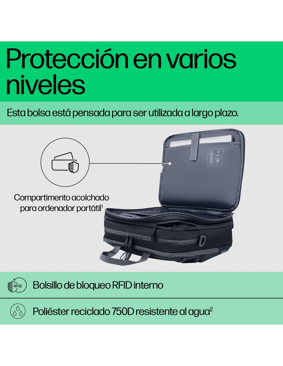 HP Bolsa para portátil de 14 pulgadas Travel Plus 15L. Tipo de funda: Maletín, Tamaño máximo de pantalla: 35,8 cm (14.1"). Peso: 820 g. Coloración de superficie: Monocromo