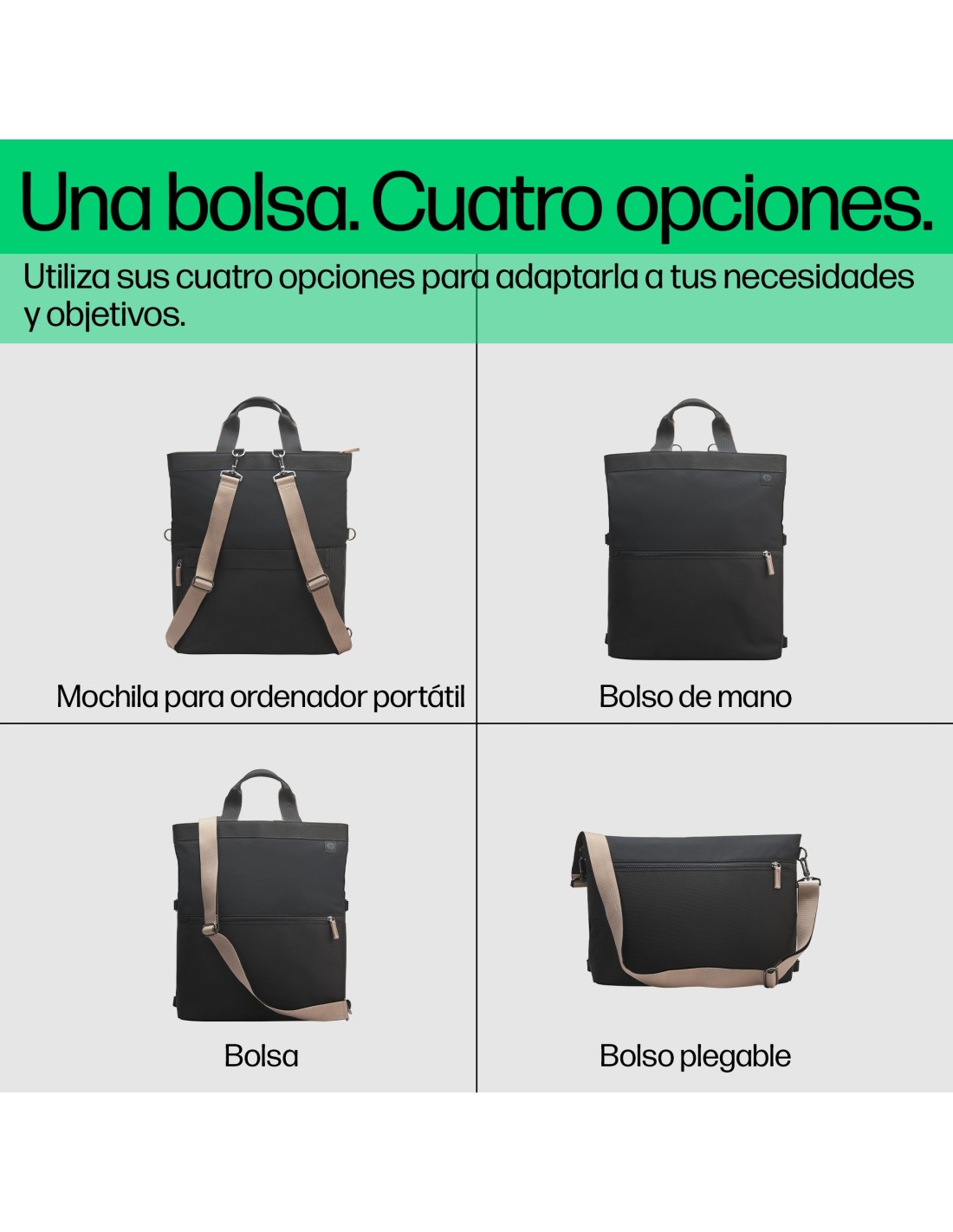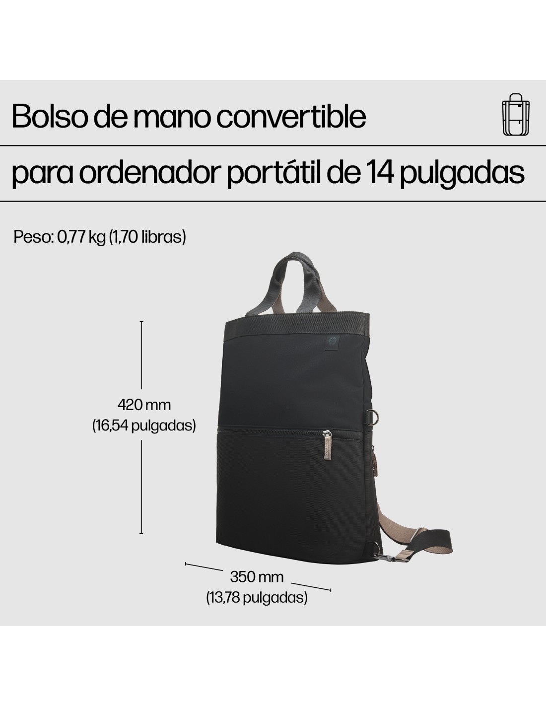 HP Bolso de mano de mochila para ordenador portátil convertible de 14 pulgadas. Tipo de funda: Mochila, Tamaño máximo de pantalla: 35,8 cm (14.1"). Peso: 770 g. Coloración de superficie: Monocromo
