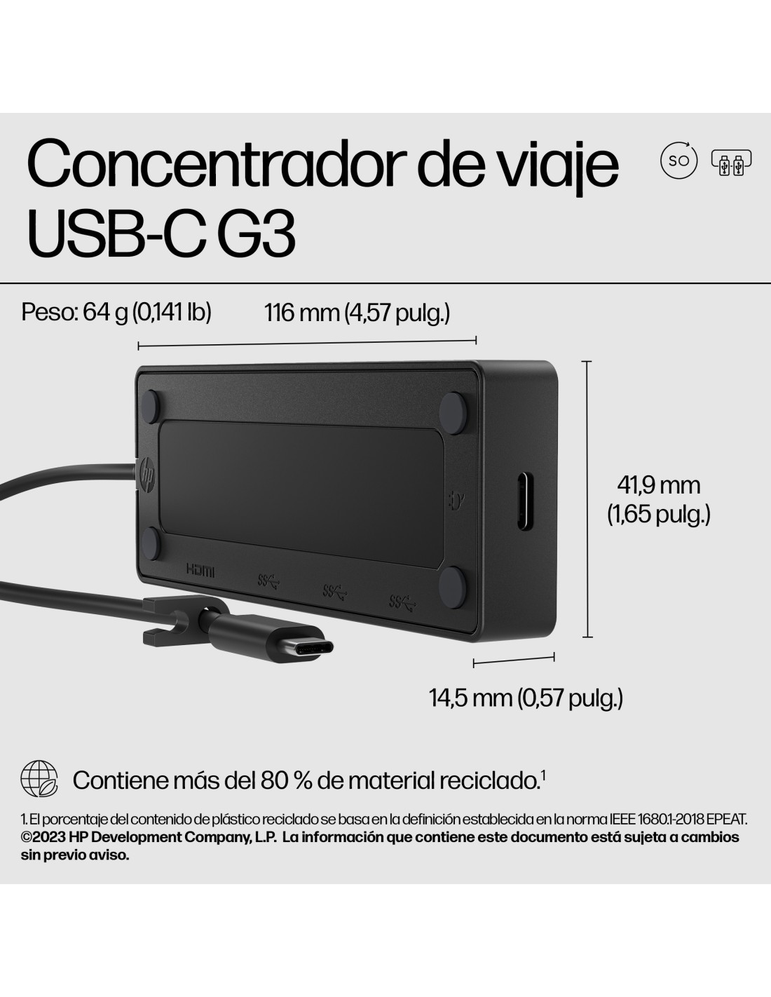 HP Concentrador de viaje USB-C G3, Alámbrico, USB 3.2 Gen 2 (3.1 Gen 2) Type-C, 60 Hz, HDMI, USB 3.2 Gen 2 (3.1 Gen 2) Type-A, USB 3.2 Gen 2 (3.1 Gen 2) Type-C, Vietnam, Negocios