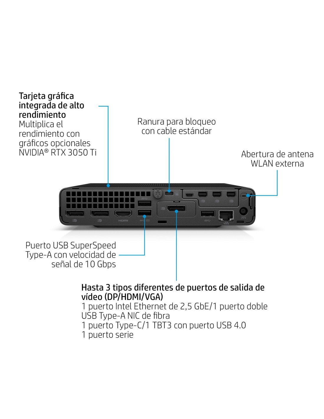 HP Elite Mini 800 G9. Familia de procesador: Intel® Core™ i7, Modelo del procesador: i7-14700. Memoria interna: 16 GB, Tipo de memoria interna: DDR5-SDRAM, Velocidad de memoria del reloj: 4800 MHz. Capacidad total de almacenaje: 512 GB, Unidad de almacenamiento: SSD. Modelo de adaptador gráfico incorporado: Intel® UHD Graphics. Wifi. Sistema operativo instalado: Windows 11 Pro. Fuente de alimentación: 120 W. Tipo de chasis: Mini PC. Tipo de producto: Mini PC. Peso: 1,42 kg. Color del producto: Negro
