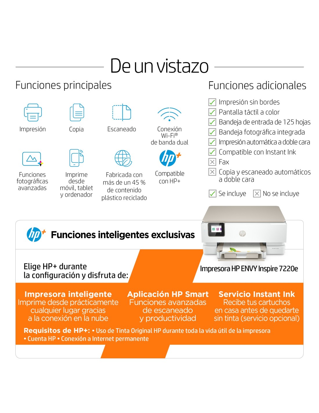 Esta es una impresora habilitada para HP+. Elige HP+ en la configuración del producto para activar las ventajas. HP+ requiere una cuenta HP, una conexión permanente a Internet y el uso exclusivo de cartuchos de Tinta Originales HP durante la vida útil de la impresora. Más información: http://www.hp.com/plus