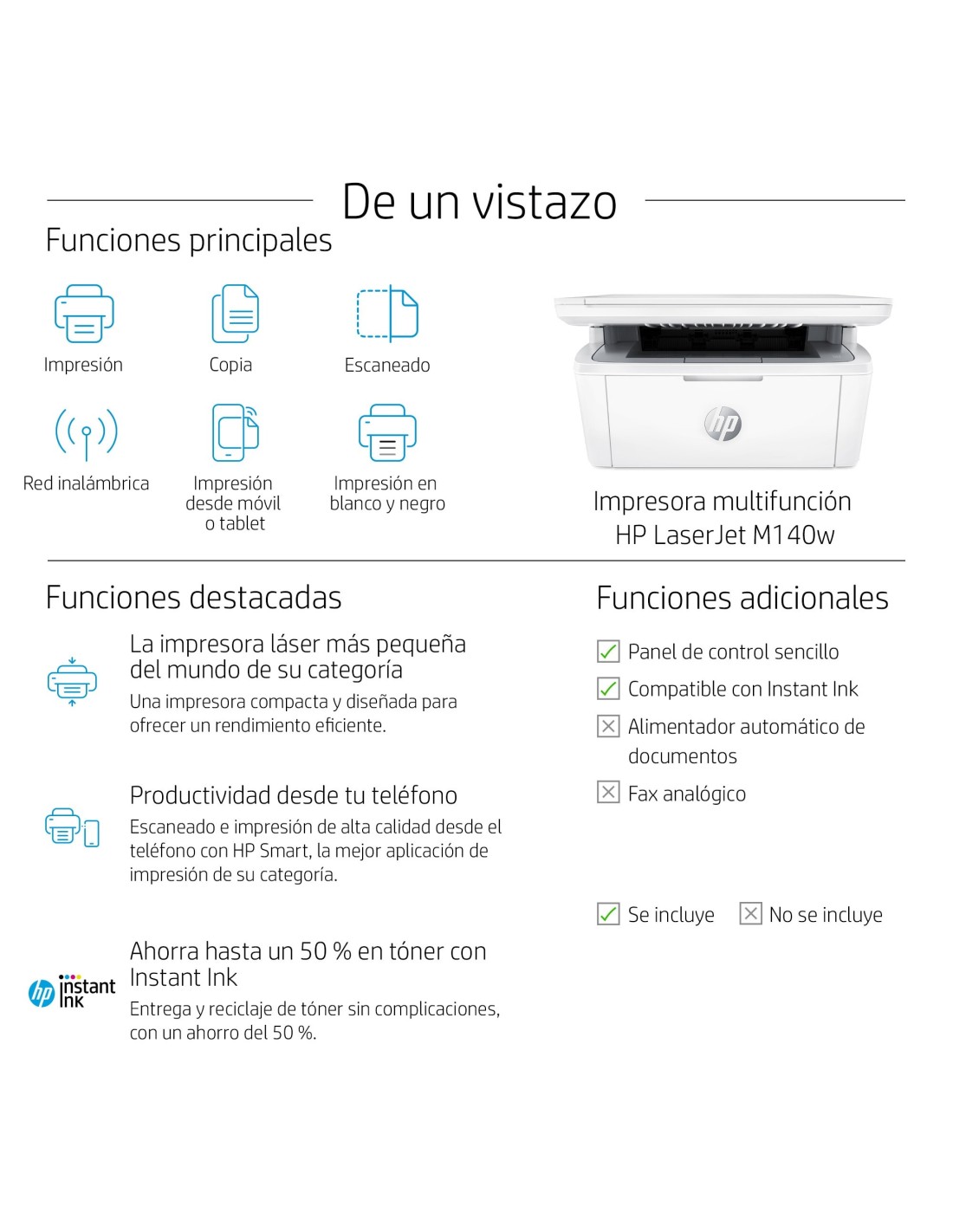 HP LaserJet Impresora multifunción M140w. Tecnología de impresión: Laser, Impresión: Impresión en blanco y negro, Resolución máxima: 600 x 600 DPI. Copiando: Copias en blanco y negro, Resolución máxima de copia: 600 x 400 DPI. Escaneando: Escaneo a color, Resolución óptica de escáner: 600 x 600 DPI. Tamaño máximo de papel ISO A-series: A4. Wifi. Impresión directa. Color del producto: Blanco