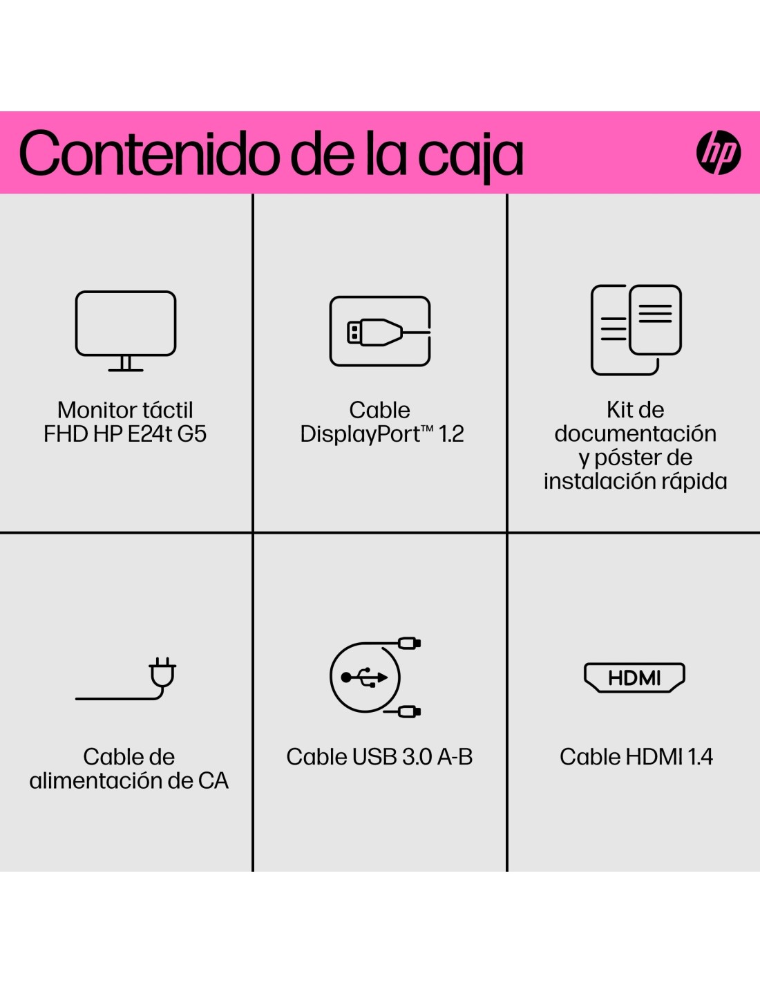 HP Monitor FHD E24t G5 con pantalla táctil. Diagonal de la pantalla: 60,5 cm (23.8"), Resolución de la pantalla: 1920 x 1080 Pixeles, Tipo HD: Full HD, Tecnología de visualización: LCD, Superficie de la pantalla: Mate, Tiempo de respuesta: 5 ms, Relación de aspecto nativa: 16:9, Ángulo de visión, horizontal: 178°, Ángulo de visión, vertical: 178°. Conector USB incorporado, Versión de conector USB: 3.2 Gen 1 (3.1 Gen 1). montaje VESA, Ajustes de altura. Color del producto: Negro