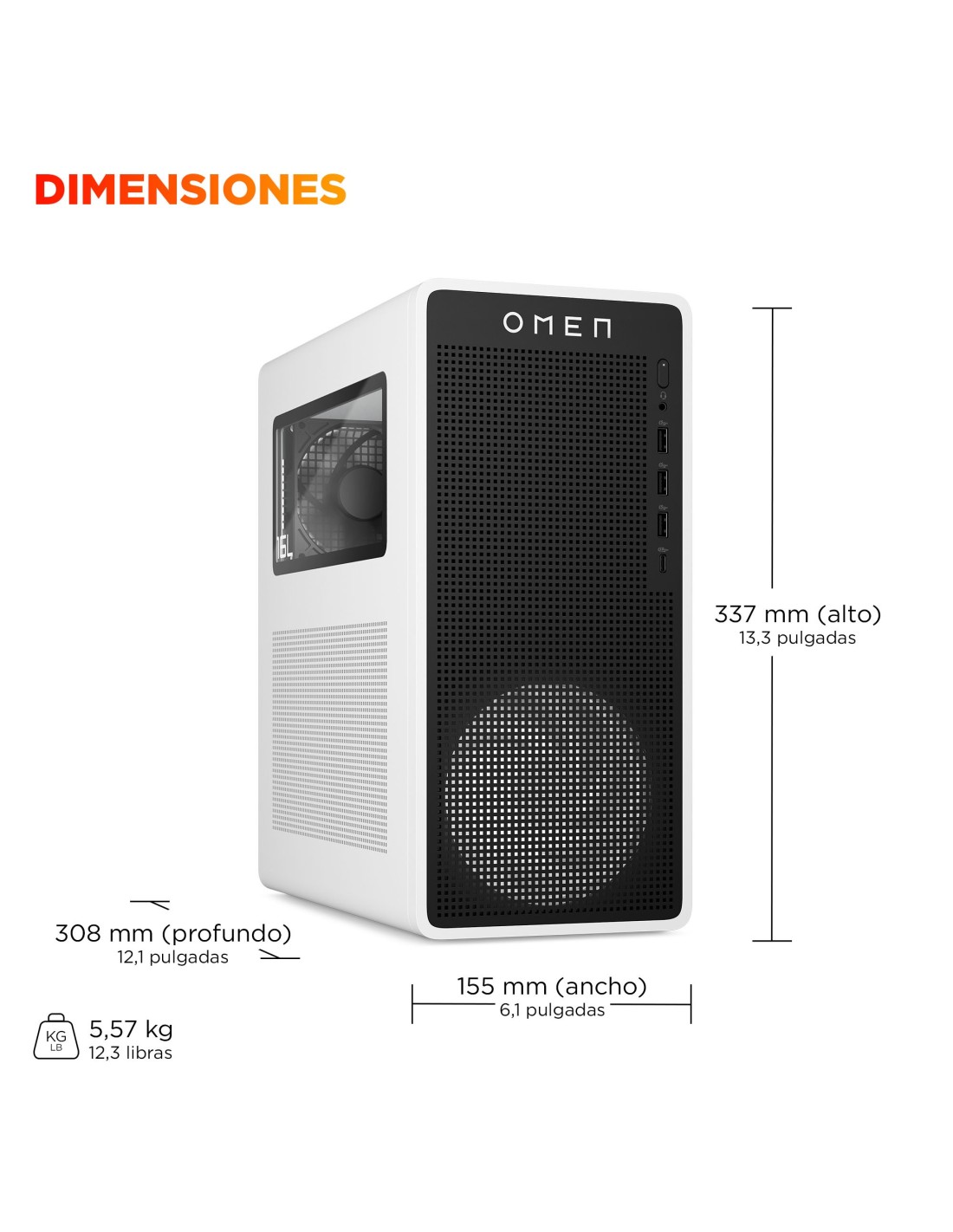 HP OMEN 16L TG03-0094ns. Familia de procesador: Intel Core Ultra 5, Modelo del procesador: 225F. Memoria interna: 32 GB, Tipo de memoria interna: DDR5-SDRAM, Velocidad de memoria del reloj: 5600 MHz. Capacidad total de almacenaje: 1 TB, Unidad de almacenamiento: SSD. Modelo de adaptador de gráficos discretos: NVIDIA GeForce RTX 5060. Wifi. Sistema operativo instalado: FreeDOS. Fuente de alimentación: 400 W. Tipo de chasis: Torre. Tipo de producto: PC. Peso: 5,82 kg. Color del producto: Blanco