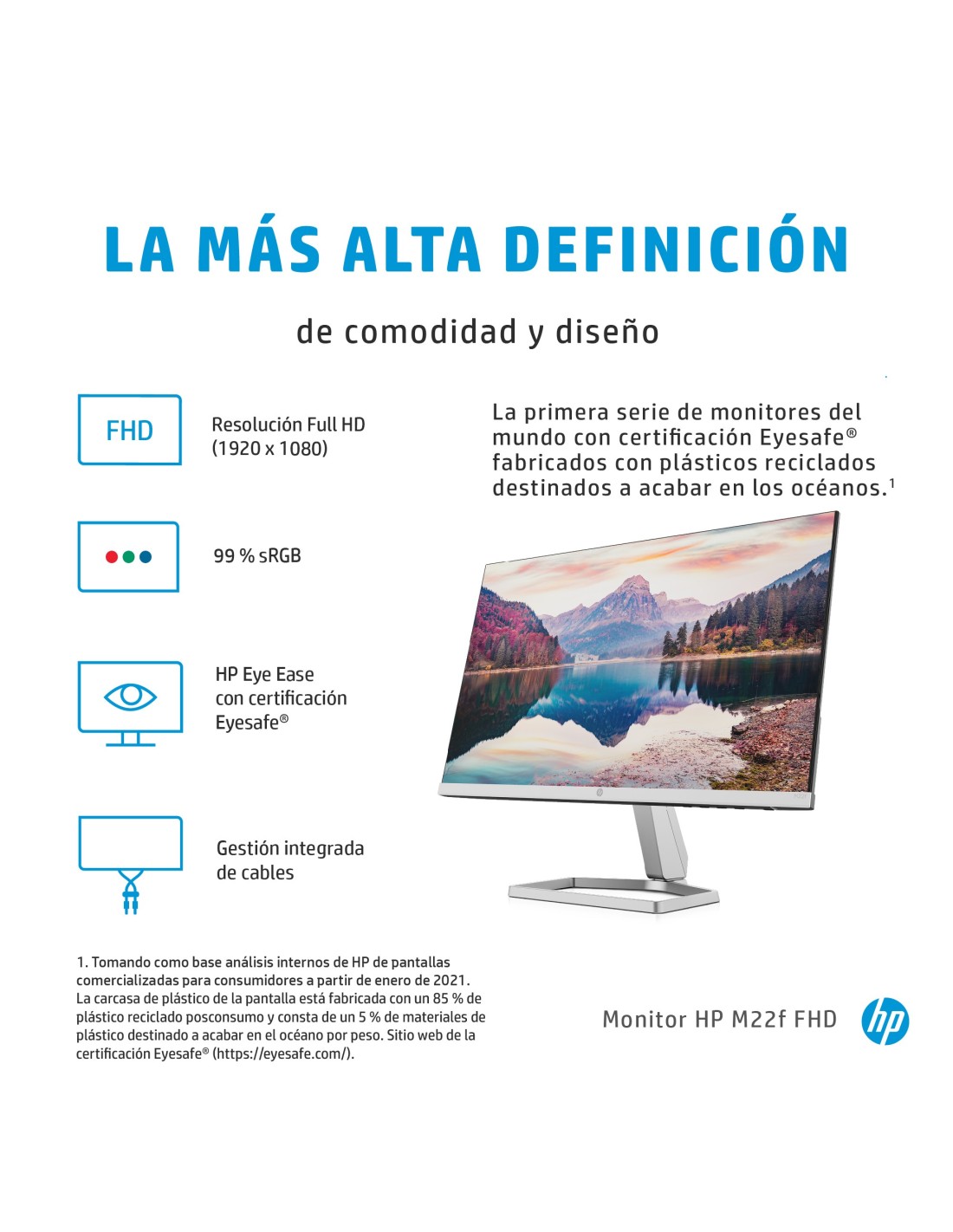 HP Pantalla M22f FHD. Diagonal de la pantalla: 54,6 cm (21.5"), Resolución de la pantalla: 1920 x 1080 Pixeles, Tipo HD: Full HD, Tecnología de visualización: LCD, Superficie de la pantalla: Mate, Tiempo de respuesta: 5 ms, Relación de aspecto nativa: 16:9, Ángulo de visión, horizontal: 178°, Ángulo de visión, vertical: 178°. Color del producto: Negro, Plata