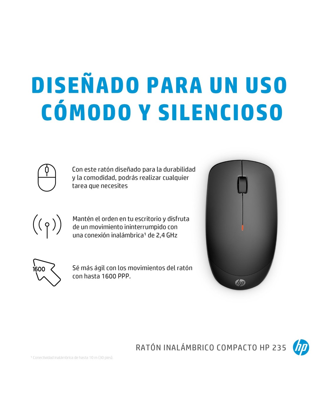 HP Ratón inalámbrico compacto 235. Factor de forma: Ambidextro. Tecnología de detección de movimientos: Óptico, Interfaz del dispositivo: RF inalámbrico, Resolución de movimiento: 1600 DPI, Tipo de botones: Botones presionados, Cantidad de botones: 3, Tipo de desplazamiento: Rueda. Fuente de energía: Baterías. Color del producto: Negro