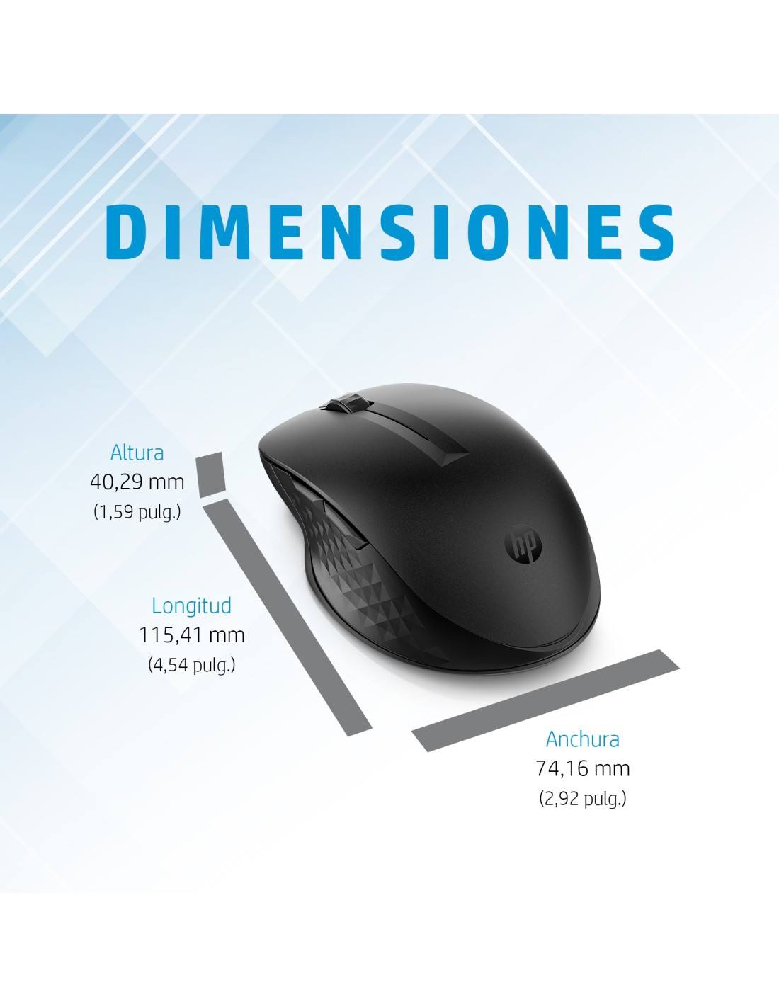 HP Ratón inalámbrico multidispositivo 435. Factor de forma: Ambidextro. Interfaz del dispositivo: RF Wireless + Bluetooth, Resolución de movimiento: 4000 DPI, Tipo de botones: Botones presionados, Cantidad de botones: 5, Tipo de desplazamiento: Rueda. Fuente de energía: Baterías. Color del producto: Negro