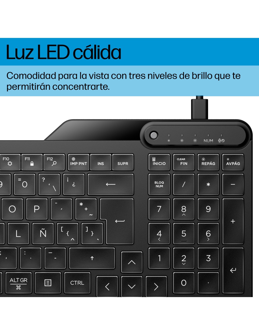 Un teclado para todos los días Este teclado con teclas iluminadas en blanco cálido siempre está listo para los desplazamientos. Conéctalo a tu dispositivo y escribe con sus silenciosas teclas y sus tres niveles de brillo LED retroiluminado. Además, podrás disparar tu productividad gracias a sus 12 teclas programables. Trabaja y juega durante todo el día con el teclado que puede desinfectarse[1] con cable retroiluminado HP 405.