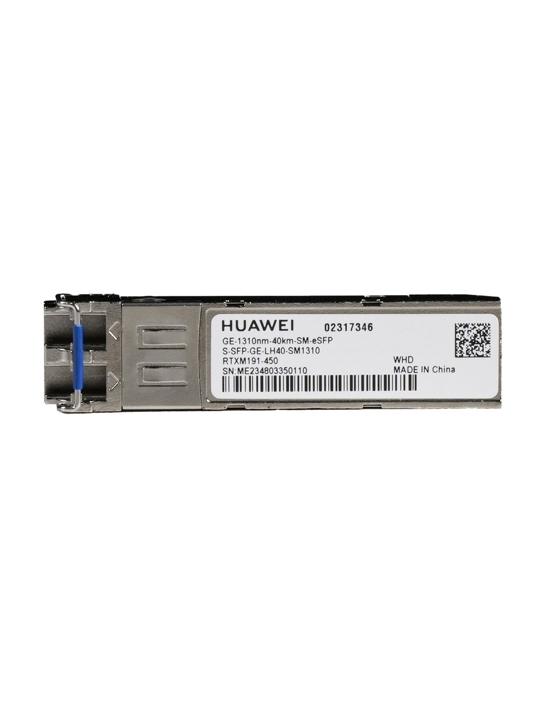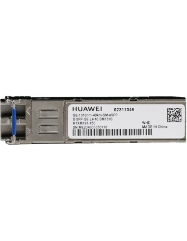 HUAWEI eKit S-SFP-GE-LH40-SM1310. Tipo de transceptor SFP: Fibra óptica, Rango máximo de transferencia de datos: 1000 Mbit/s, Conector fibra óptica: LC. Color del producto: Metálico, Material de la carcasa: Metal, Factor de forma: eSFP. Cantidad por paquete: 1 pieza(s)