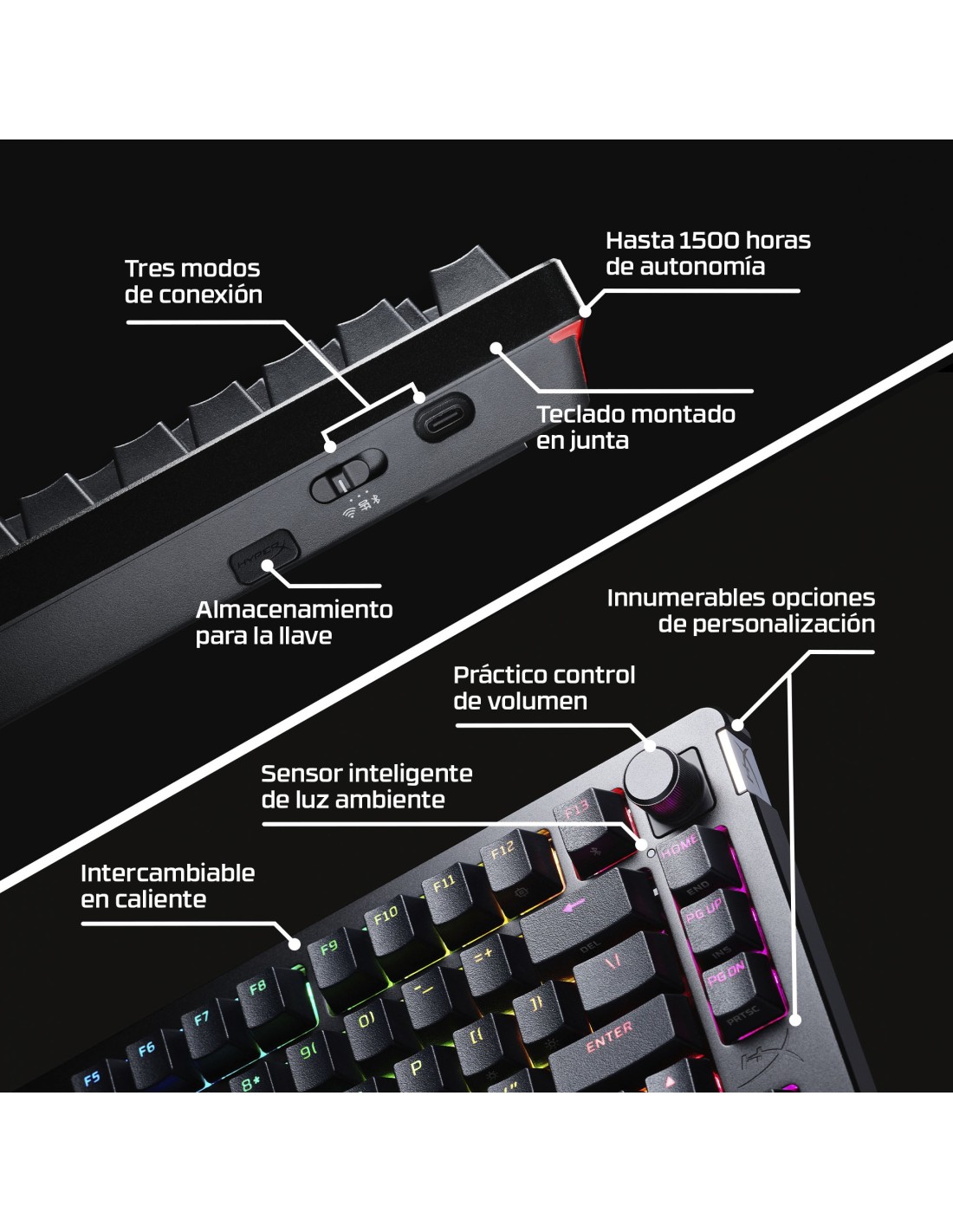La mayor duración de la batería en un teclado gaming dual inalámbrico retroiluminado Con la mayor duración de batería en un teclado gaming dual inalámbrico retroiluminado del mercado1, tus aventuras nunca se acabarán demasiado pronto gracias al teclado gaming HyperX Alloy Rise 75 Wireless. Sumérgete en la emoción ininterrumpida de jugar con 80 horas de juego inmersivo retroiluminado o supera los límites con una asombrosa cifra de 1500 horas con la retroiluminación desactivada2. Elige entre una conexión inalámbrica de 2,4 GHz fluida o alterna entre hasta 3 dispositivos mediante Bluetooth. Adapta tus aventuras a tu gusto con el teclado gaming más personalizable. No solo te permite intercambiar en caliente los interruptores de las teclas, sino que también puedes hacer lo mismo con las placas superiores magnéticas y los distintivos, entre otras muchas opciones. Actualiza tu configuración gaming con nuestro elegante factor de forma del 75 %, que ofrece un gran equilibrio entre funcionalidad y tamaño, gracias a sus flechas de dirección dedicadas, teclas de navegación, teclas de función o el botón de volumen giratorio. Este teclado cuenta con una veloz tasa de sondeo de 1000 para una rápida detección de las pulsaciones al utilizar nuestros interruptores lineales prelubricados HyperX, con una vida útil de más de 80 millones de pulsaciones3. Asimismo, mejorarás el ambiente de juego gracias al sensor de luz ambiental, que ajusta de forma automática el brillo según la iluminación ambiental.