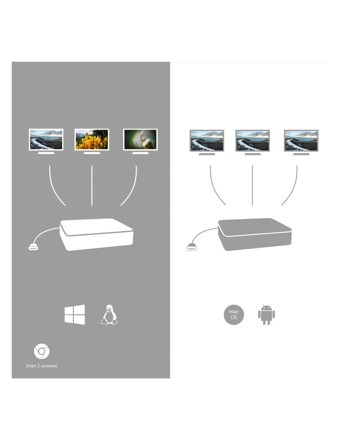 Nota: el sistema operativo macOS no soporta la tecnología de Multi Stream Transport (2 y más pantallas dentro del modo de extensión. Es que ningún replicador de puertos que utiliza el USB-C DisplayPort Alt Mode no lo soporta en el macOS.