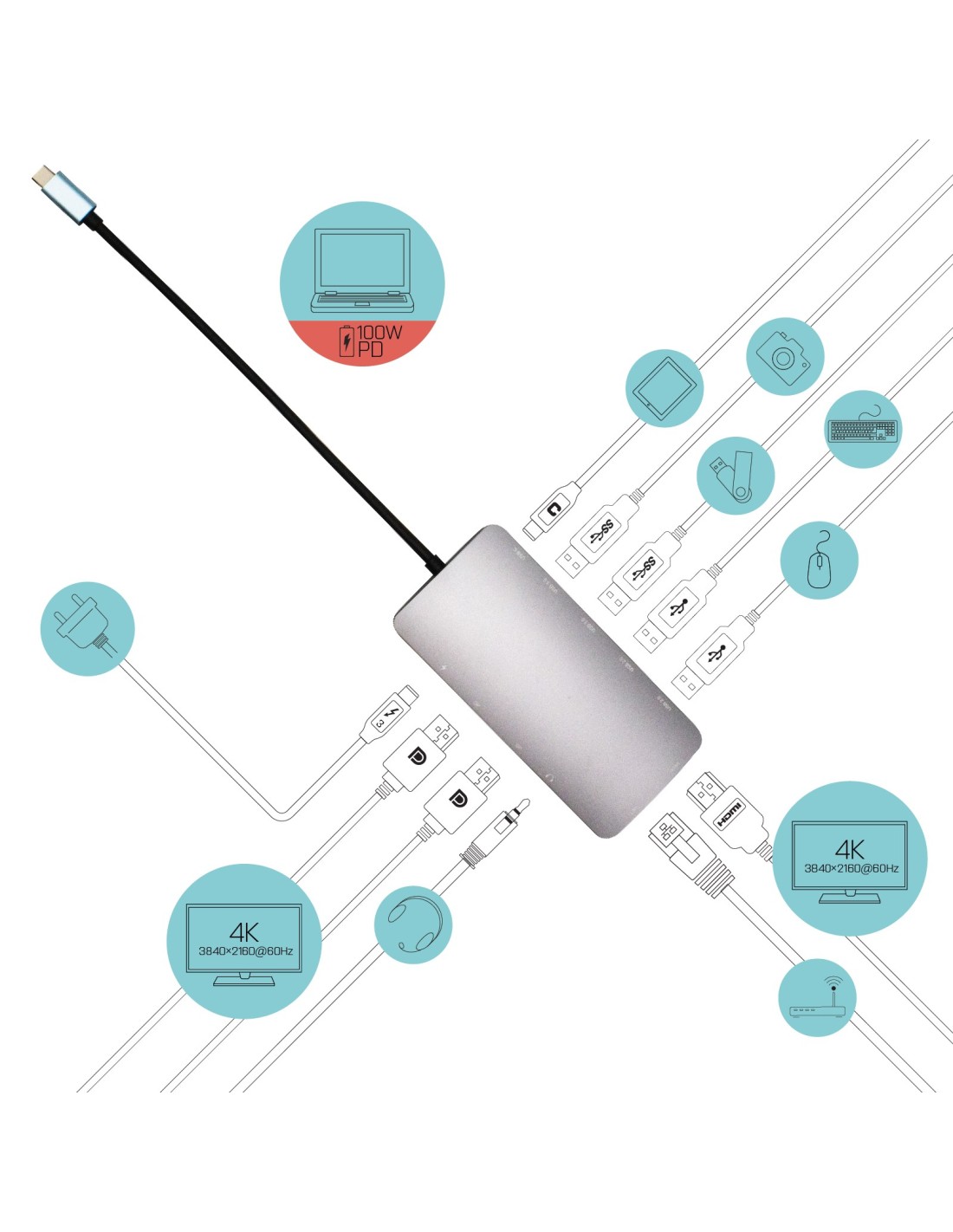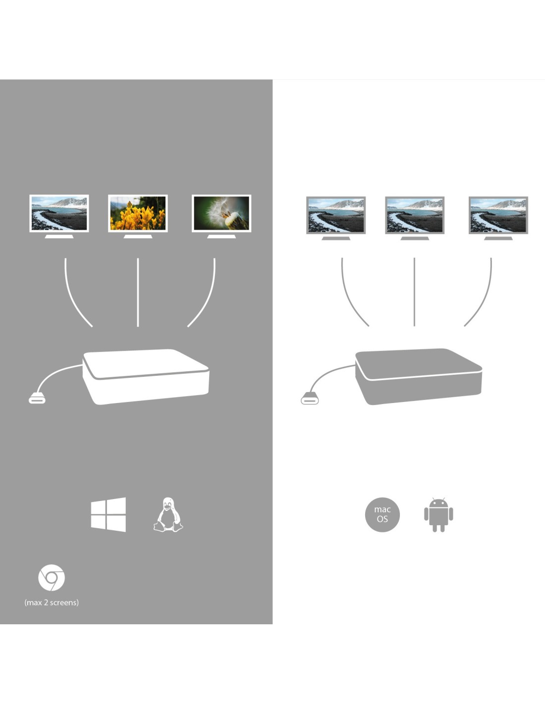Pequeña Docking Station de metal USB-C capaz de soportar hasta tres monitores externos simultáneamente *. Simplemente conecte su computadora portátil o tableta (no es necesario instalar controladores) y aproveche los beneficios de la rápida transferencia de datos USB, la conexión a Internet a través de un puerto LAN y la capacidad de conectar sus auriculares. Y, por supuesto, la Docking Station también puede alimentar su portátil con hasta 100 W, lo que significa que podrá cargar todas los portátiles y tabletas que admitan la carga a través de USB-C (USB-C Power Delivery).