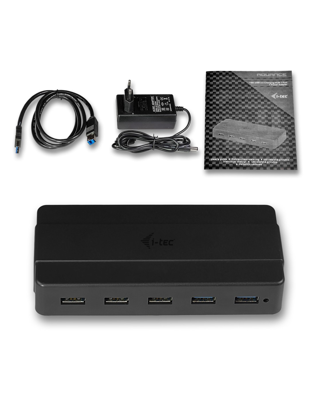 i-tec USB 3.0 Charging HUB 7 Port + Power Adapter. Interfaz de host: USB 3.2 Gen 1 (3.1 Gen 1) Type-B, Interfaces de concentradores: USB 3.2 Gen 1 (3.1 Gen 1) Type-A. Velocidad de transferencia de datos: 5000 Mbit/s, Color del producto: Negro, Longitud de cable: 0,9 m. Alimentación: Corriente alterna, Voltaje de entrada: 100 - 240 V, Corriente de entrada: 1 A. Ancho: 133 mm, Profundidad: 60 mm, Altura: 27 mm. Ancho del paquete: 230 mm, Profundidad del paquete: 112 mm, Altura del paquete: 56 mm