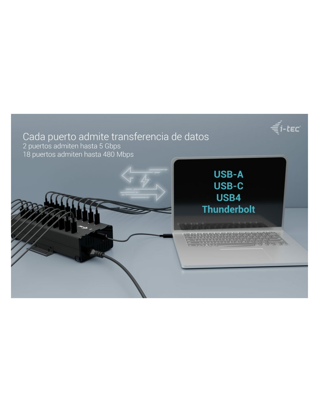 Este moderno HUB ofrece 20 USB-C con funcionalidad Plug & Play y hasta 15 W de carga por puerto. Con 20 puertos USB, el HUB puede cargar hasta 20 dispositivos a la vez.