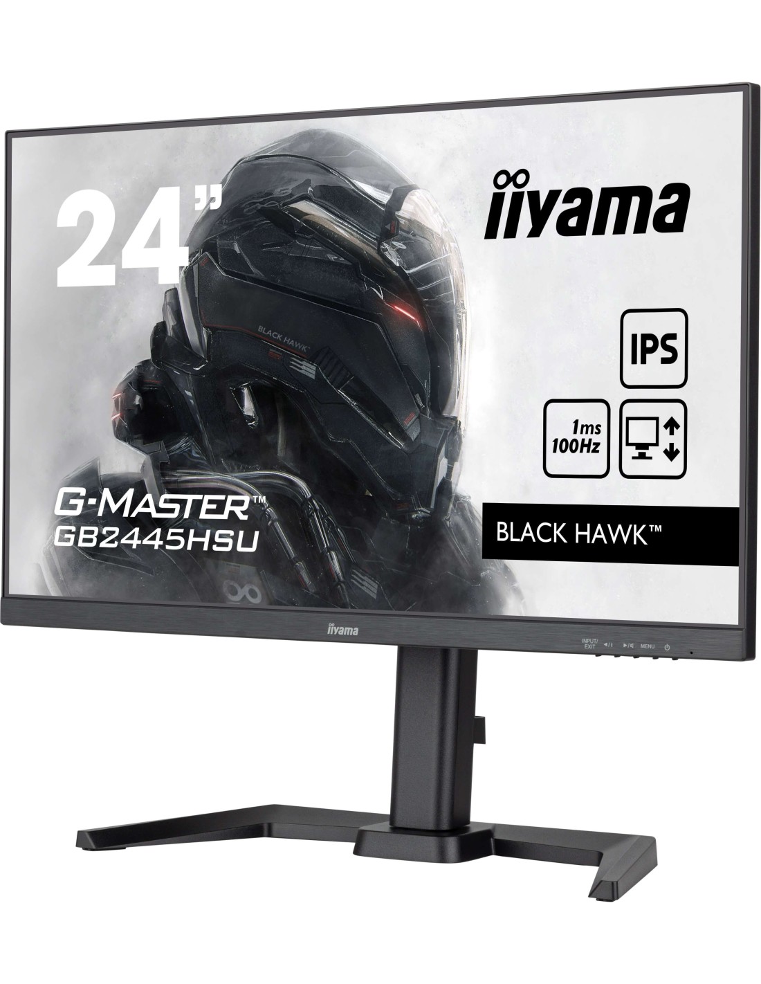 iiyama G-MASTER GB2445HSU-B2. Diagonal de la pantalla: 58,4 cm (23"), Resolución de la pantalla: 1920 x 1080 Pixeles, Tipo HD: Full HD, Tecnología de visualización: LED, Superficie de la pantalla: Mate, Tiempo de respuesta: 1 ms, Relación de aspecto nativa: 16:9, Ángulo de visión, horizontal: 178°, Ángulo de visión, vertical: 178°. Altavoces incorporados. Conector USB incorporado, Versión de conector USB: 2.0. montaje VESA, Ajustes de altura. Color del producto: Negro