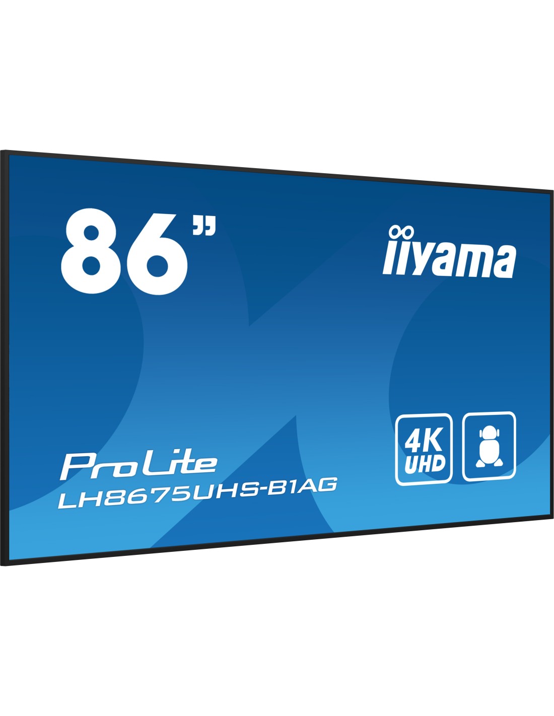 iiyama LH8675UHS-B1AG. Diseño de producto: Pantalla plana para señalización digital. Diagonal de la pantalla: 2,17 m (85.6"), Tecnología de visualización: LCD, Resolución de la pantalla: 3840 x 2160 Pixeles, Brillo de pantalla: 500 cd / m², Tipo HD: 4K Ultra HD. Wifi. Horas de funcionamiento (horas/días): 24/7. Sistema operativo instalado: Android 11. Color del producto: Negro