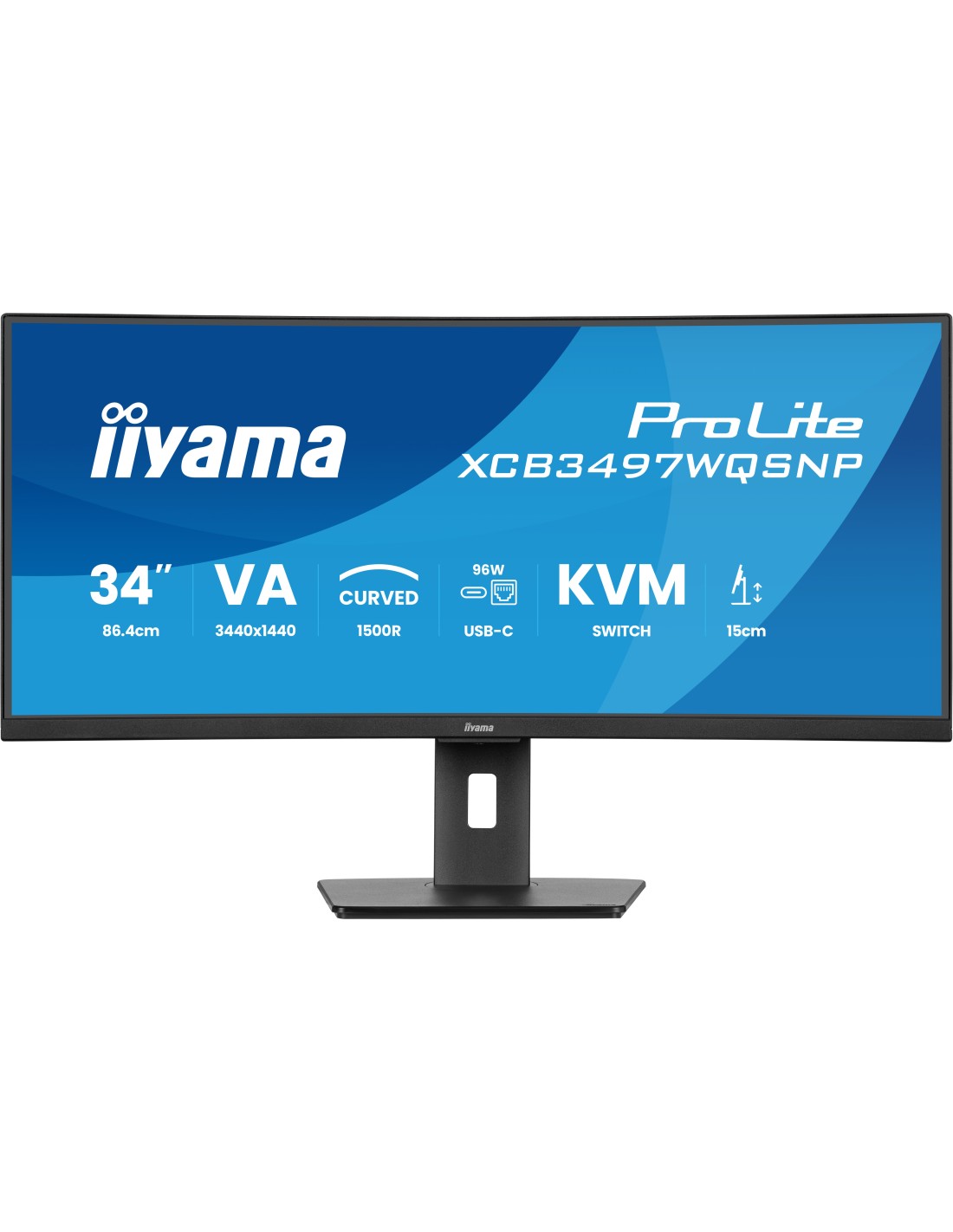 iiyama ProLite XCB3497WQSNP-B1. Diagonal de la pantalla: 86,4 cm (34"), Resolución de la pantalla: 3440 x 1440 Pixeles, Tipo HD: UltraWide Quad HD, Tecnología de visualización: LED, Superficie de la pantalla: Mate, Relación de aspecto nativa: 21:9, Ángulo de visión, horizontal: 178°, Ángulo de visión, vertical: 178°. Altavoces incorporados. Conector USB incorporado, Versión de conector USB: 3.2 Gen 1 (3.1 Gen 1). montaje VESA, Ajustes de altura. Color del producto: Negro