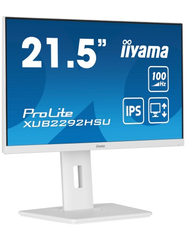 iiyama ProLite XUB2292HSU-W6. Diagonal de la pantalla: 54,6 cm (21.5"), Resolución de la pantalla: 1920 x 1080 Pixeles, Tipo HD: Full HD, Tecnología de visualización: LED, Superficie de la pantalla: Mate, Tiempo de respuesta: 0,4 ms, Relación de aspecto nativa: 16:9, Ángulo de visión, horizontal: 178°, Ángulo de visión, vertical: 178°. Altavoces incorporados. Conector USB incorporado, Versión de conector USB: 3.2 Gen 1 (3.1 Gen 1). montaje VESA, Ajustes de altura. Color del producto: Blanco
