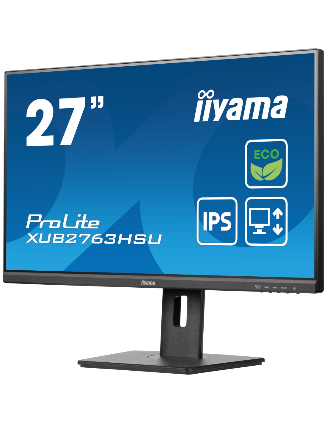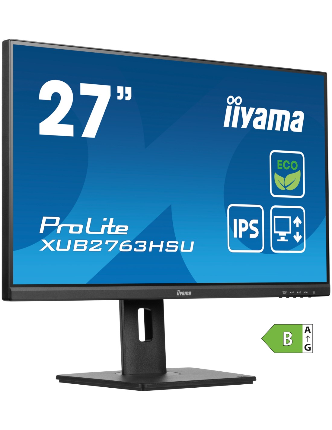 iiyama ProLite XUB2763HSU-B1. Diagonal de la pantalla: 68,6 cm (27"), Resolución de la pantalla: 1920 x 1080 Pixeles, Tipo HD: Full HD, Tecnología de visualización: LED, Superficie de la pantalla: Mate, Tiempo de respuesta: 3 ms, Relación de aspecto nativa: 16:9, Ángulo de visión, horizontal: 178°, Ángulo de visión, vertical: 178°. Altavoces incorporados. Conector USB incorporado, Versión de conector USB: 3.2 Gen 1 (3.1 Gen 1). montaje VESA, Ajustes de altura. Color del producto: Negro