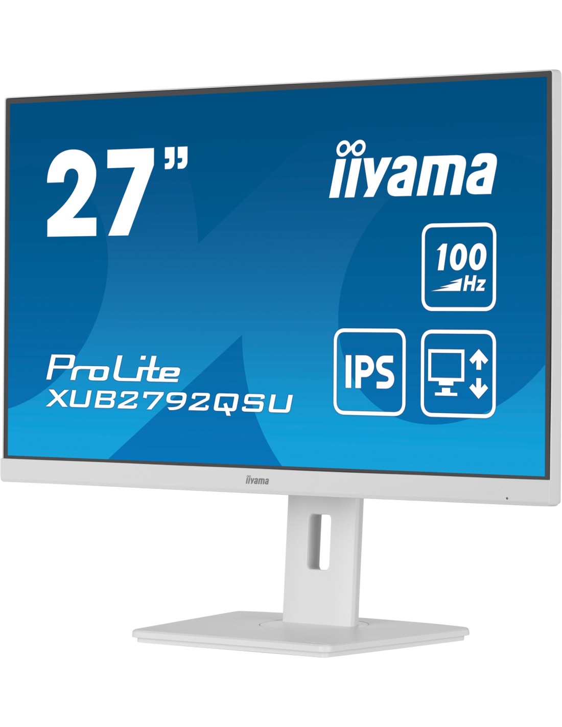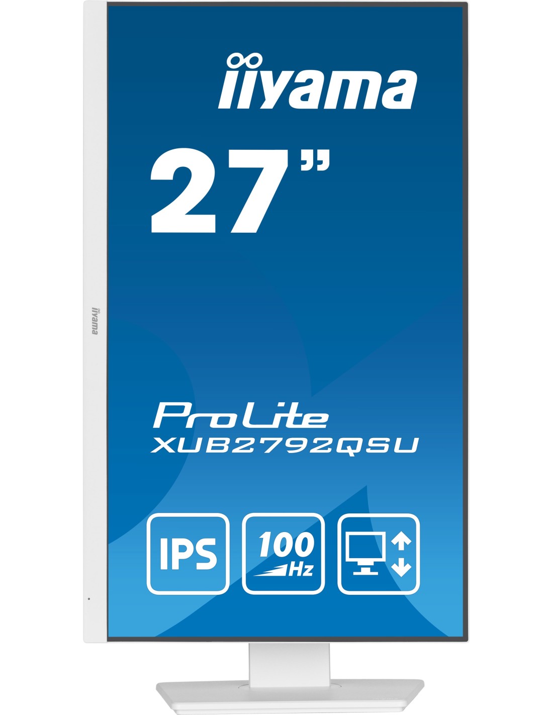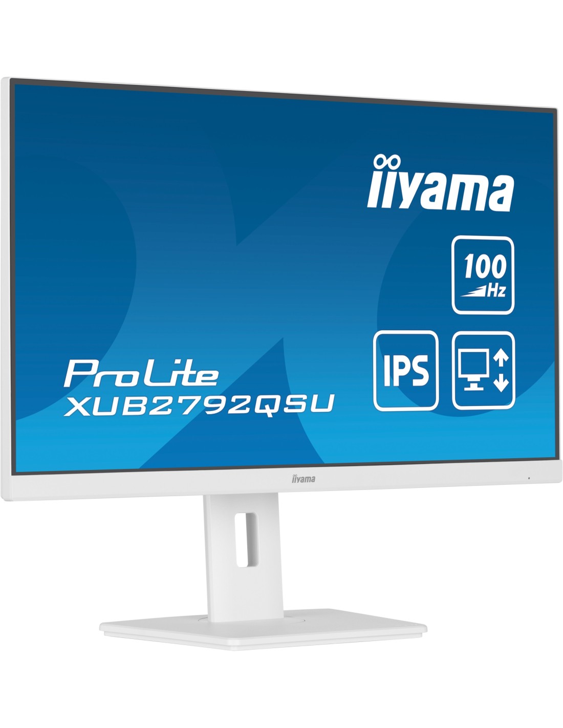 iiyama ProLite XUB2792QSU-W6. Diagonal de la pantalla: 68,6 cm (27"), Resolución de la pantalla: 2560 x 1440 Pixeles, Tipo HD: Quad HD, Tecnología de visualización: LED, Superficie de la pantalla: Mate, Tiempo de respuesta: 0,4 ms, Relación de aspecto nativa: 16:9, Ángulo de visión, horizontal: 178°, Ángulo de visión, vertical: 178°. Altavoces incorporados. Conector USB incorporado, Versión de conector USB: 3.2 Gen 1 (3.1 Gen 1). montaje VESA, Ajustes de altura. Color del producto: Blanco