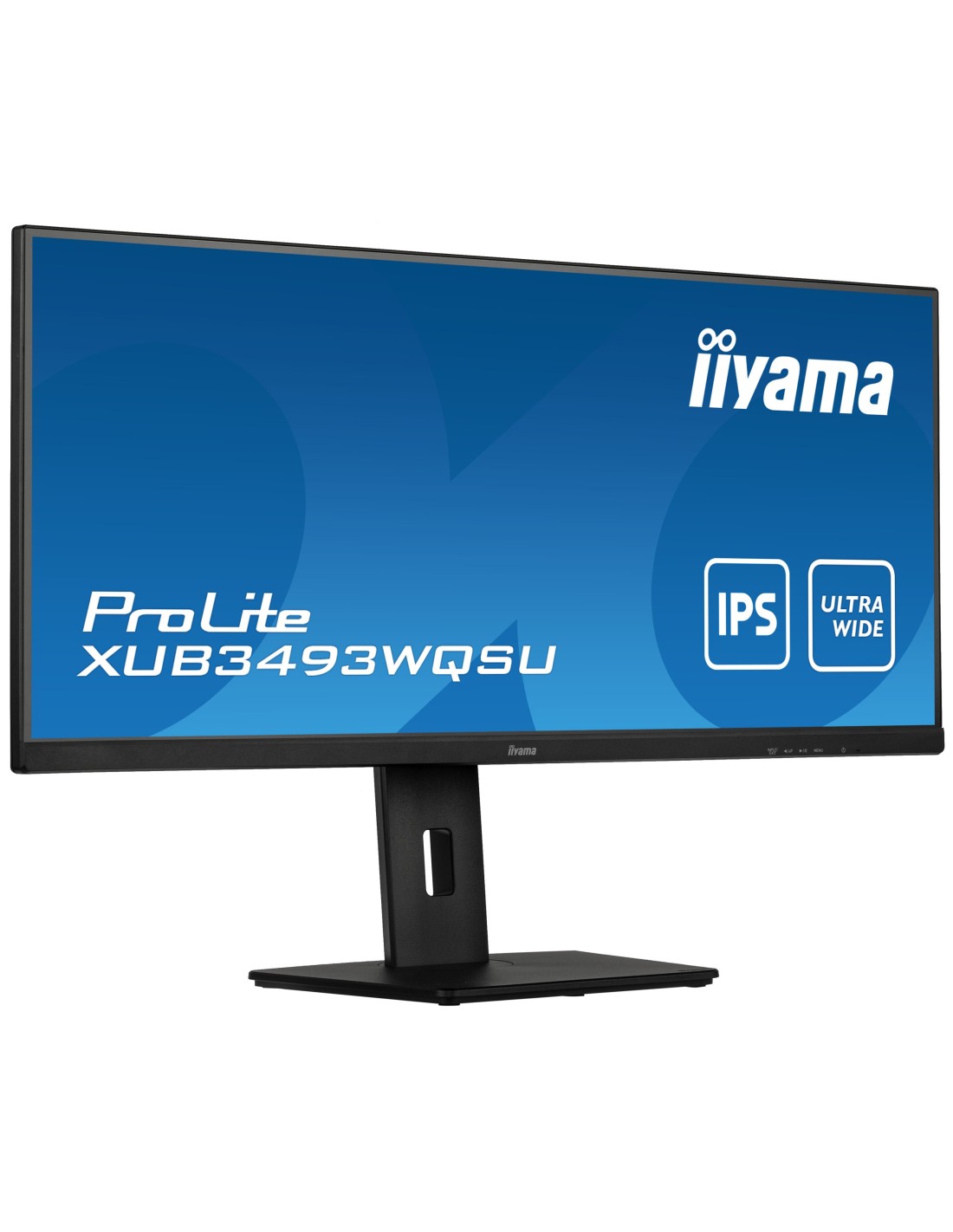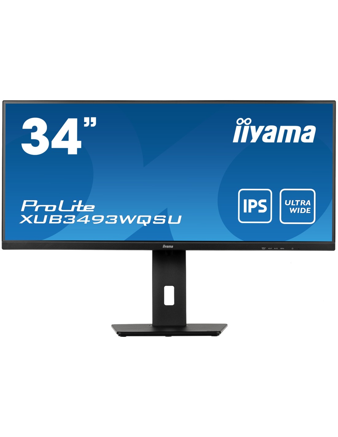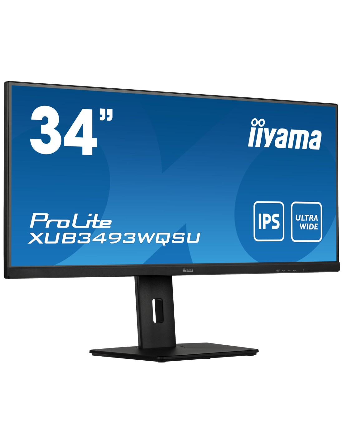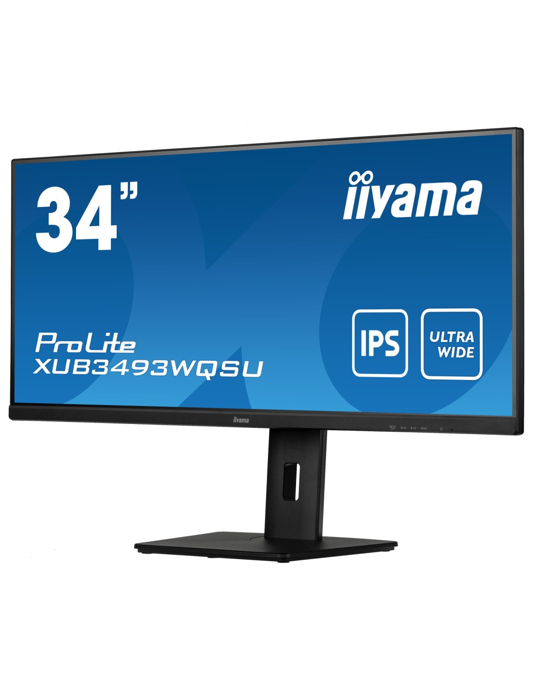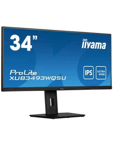 iiyama ProLite XUB3493WQSU-B5. Diagonal de la pantalla: 86,4 cm (34"), Resolución de la pantalla: 3440 x 1440 Pixeles, Tipo HD: UltraWide Quad HD, Tecnología de visualización: LED, Superficie de la pantalla: Mate, Tiempo de respuesta: 4 ms, Relación de aspecto nativa: 21:9, Ángulo de visión, horizontal: 178°, Ángulo de visión, vertical: 178°. Altavoces incorporados. Conector USB incorporado, Versión de conector USB: 3.2 Gen 1 (3.1 Gen 1). montaje VESA, Ajustes de altura. Color del producto: Negro