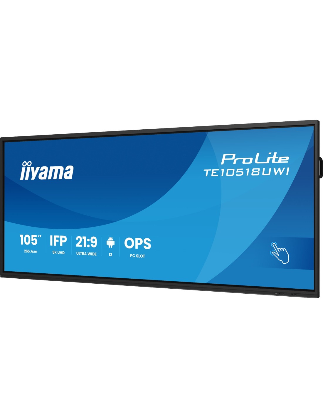 iiyama TE10518UWI-B1AG. Diseño de producto: Pizarra de caballete digital. Diagonal de la pantalla: 2,66 m (104.6"), Tecnología de visualización: LED, Resolución de la pantalla: 5120 x 2160 Pixeles, Brillo de pantalla: 450 cd / m², Tipo HD: 5K Ultra HD, Pantalla táctil. Wifi. Horas de funcionamiento (horas/días): 16/7. Sistema operativo instalado: Android. Color del producto: Negro