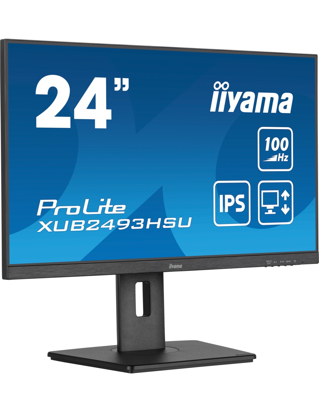 iiyama XUB2493HSU-B7. Diagonal de la pantalla: 60,5 cm (23.8"), Resolución de la pantalla: 1920 x 1080 Pixeles, Tipo HD: Full HD, Tecnología de visualización: LED, Superficie de la pantalla: Mate, Tiempo de respuesta: 1 ms, Relación de aspecto nativa: 16:9, Ángulo de visión, horizontal: 178°, Ángulo de visión, vertical: 178°. Altavoces incorporados. Conector USB incorporado, Versión de conector USB: 2.0. montaje VESA, Ajustes de altura. Color del producto: Negro