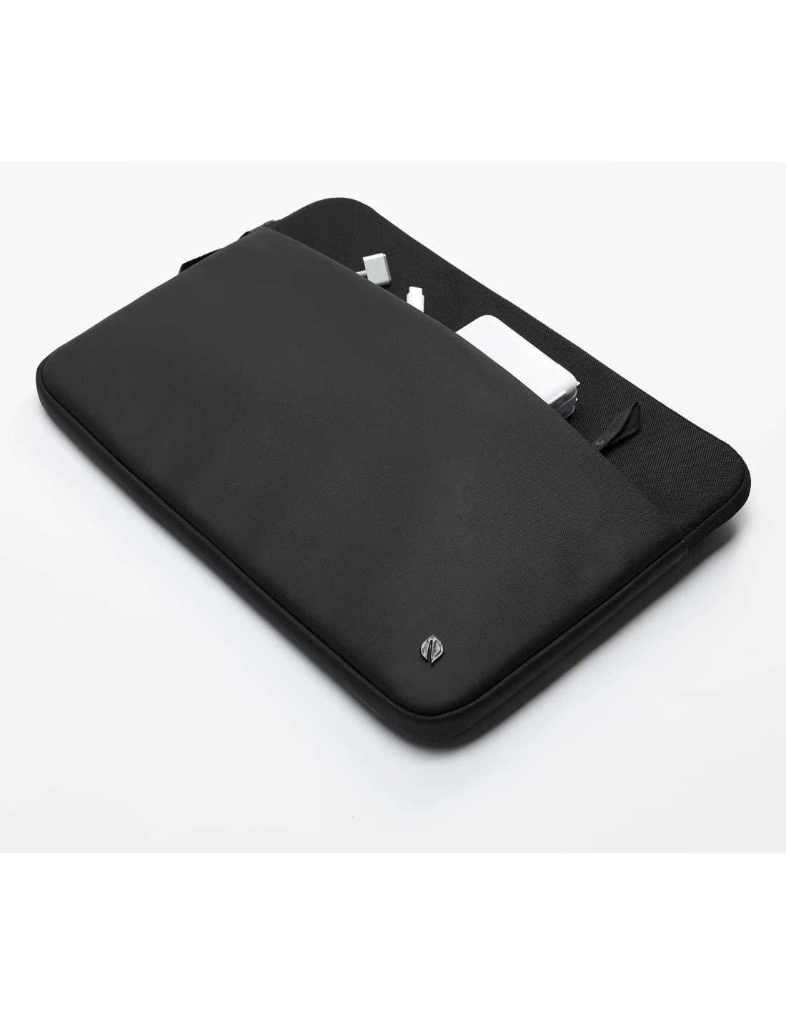 Protección y almacenamiento sobre la marcha para tu portátil con protección acolchada completa y forro interior de piel sintética. A. R. C. La funda camina por la línea de la expresión minimalista, fabricada en poliéster reciclado con cremalleras YKK y un bolsillo exterior con cremallera para guardar billetes y pequeños accesorios de cordón. Cabe un portátil de hasta 16".