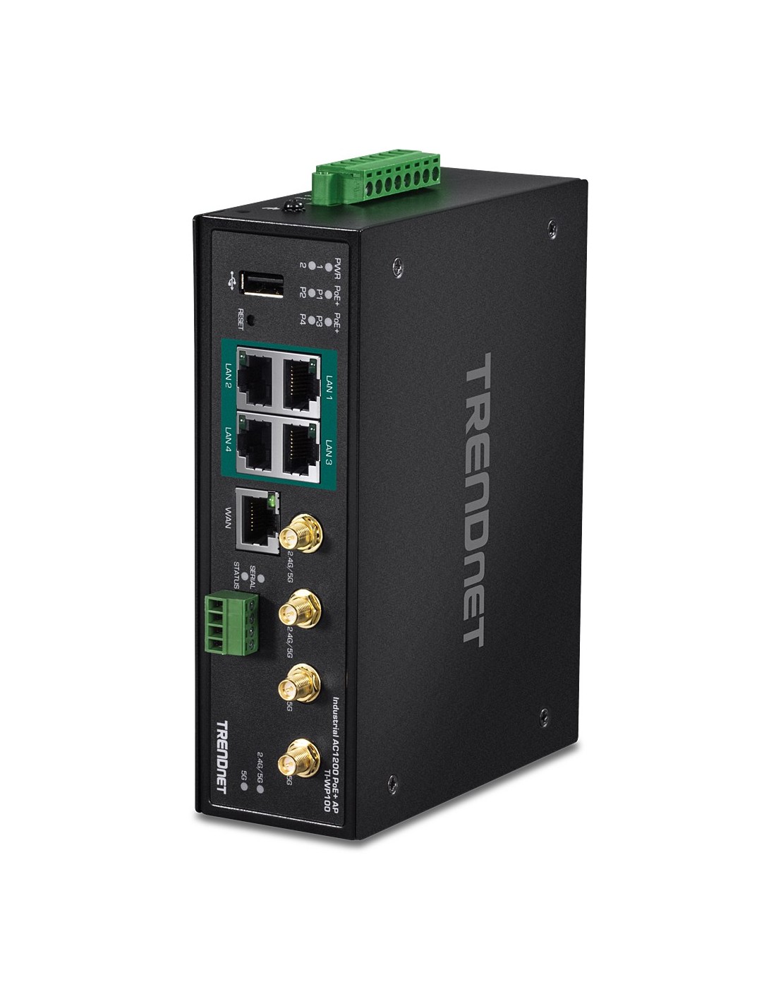 El router Gigabit PoE+ de banda dual wireless AC1200 Industrial de TRENDnet, modelo TI-WP100, dispone de WiFi AC1200 de banda dual para maximizar las velocidades de red del dispositivo; está equipado con una red AC inalámbrica a 867 Mbps y una red N inalámbrica a 300 Mbps. Admite conexiones híbridas doble WAN (Ethernet para modos de balance de cargas o tolerancia a fallos (failover)) y acceso encriptado a red privada virtual (VPN) para usuarios remotos. Cuatro puertos Gigabit PoE+ permiten a los usuarios alimentar puntos de acceso, cámaras IP y otros dispositivos PoE+ directamente desde el router. Admite dispositivos tanto PoE (802.3af) como PoE+ (802.3at), con una potencia PoE disponible de 120W. El router gigabit AC1200 industrial está equipado con una carcasa de metal con clasificación IP30 y está diseñado para funcionar dentro de un amplio intervalo de temperaturas (de -30° a 70° C (-22° a 158° F) en entornos industriales.