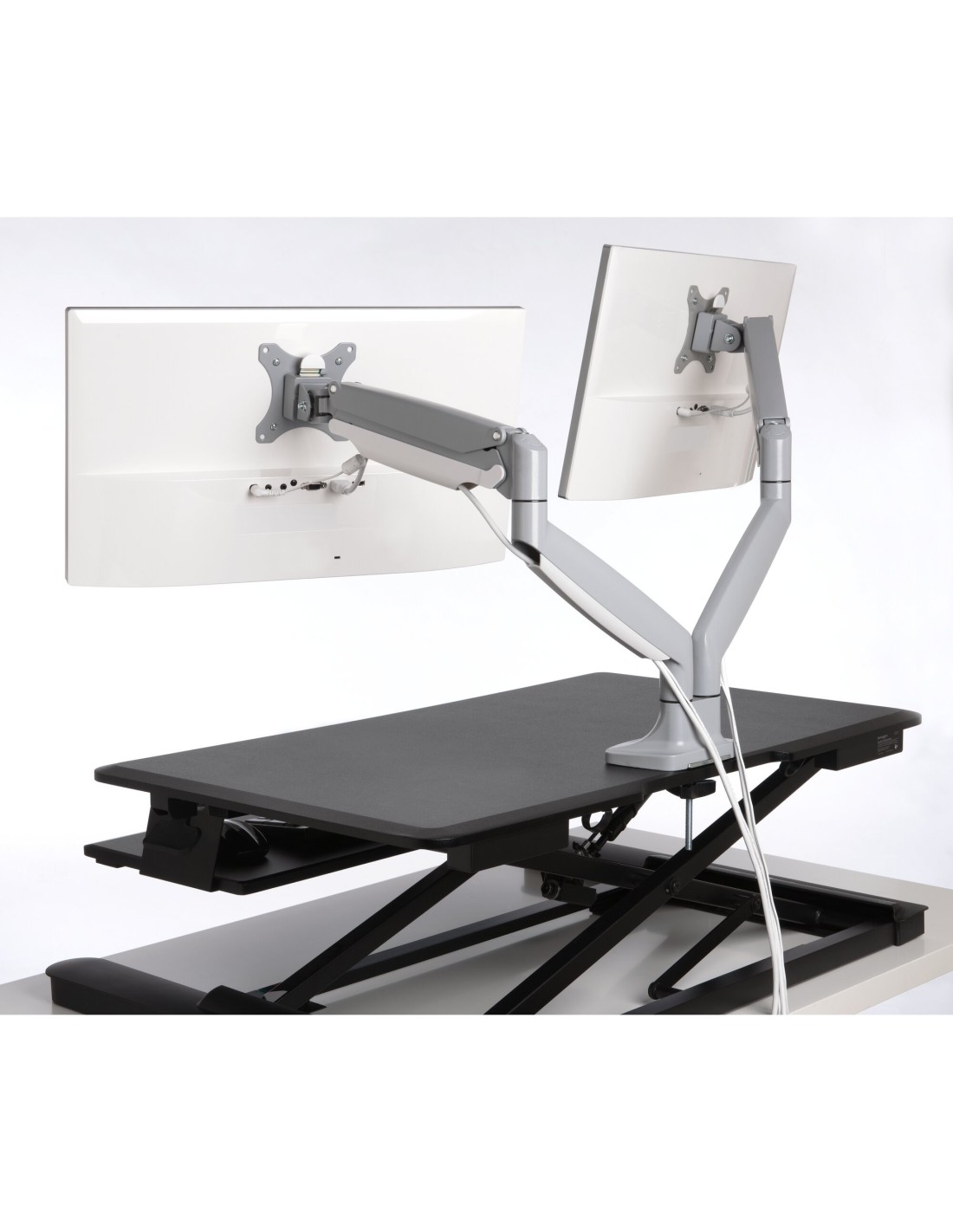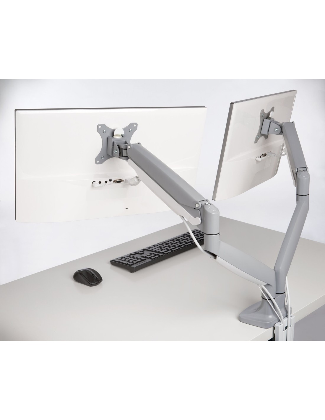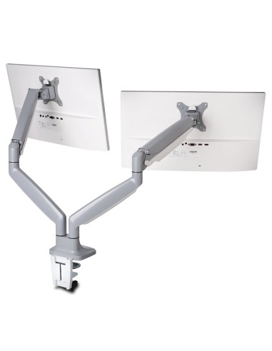 Kensington Brazo SmartFit de altura ajustable con un toque para dos monitores. Montaje: Atornillado, Capacidad máxima de peso: 9 kg, Tamaño mínimo de pantalla: 33 cm (13"), Tamaño máximo de pantalla: 81,3 cm (32"), Compatibilidad con interfaz de montaje (max): 100 x 100 mm. Ángulo de inclinación: 90 - 90°. Color del producto: Plata