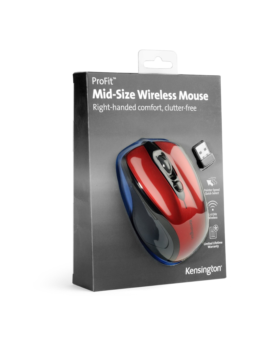Kensington Ratón inalámbrico Pro Fit tamaño mediano, rojo rubí. Factor de forma: mano derecha. Tecnología de detección de movimientos: Óptico, Interfaz del dispositivo: RF inalámbrico, Resolución de movimiento: 1600 DPI, Tipo de botones: Botones presionados, Cantidad de botones: 3, Tipo de desplazamiento: Rueda. Fuente de energía: Baterías. Color del producto: Rojo