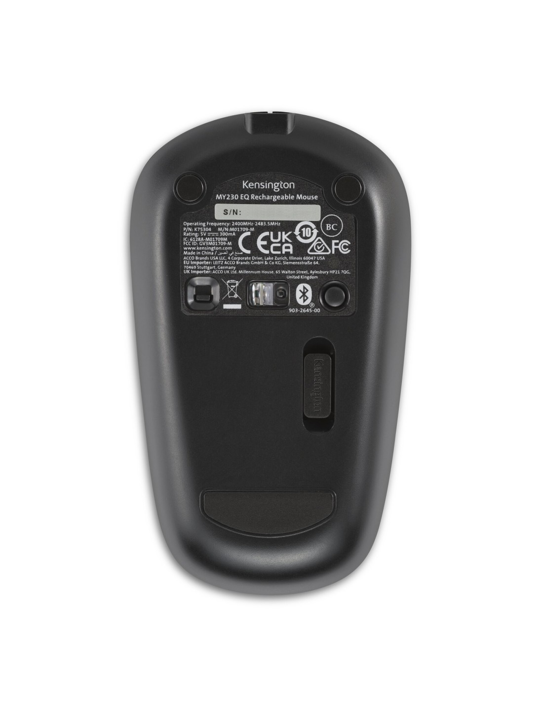 Kensington Ratón recargable MY230 EQ – Inalámbrico – Mediano. Factor de forma: Ambidextro. Interfaz del dispositivo: RF Wireless + Bluetooth, Resolución de movimiento: 1200 DPI, Tipo de botones: Botones presionados, Cantidad de botones: 3, Tipo de desplazamiento: Rueda. Fuente de energía: Baterías. Color del producto: Negro