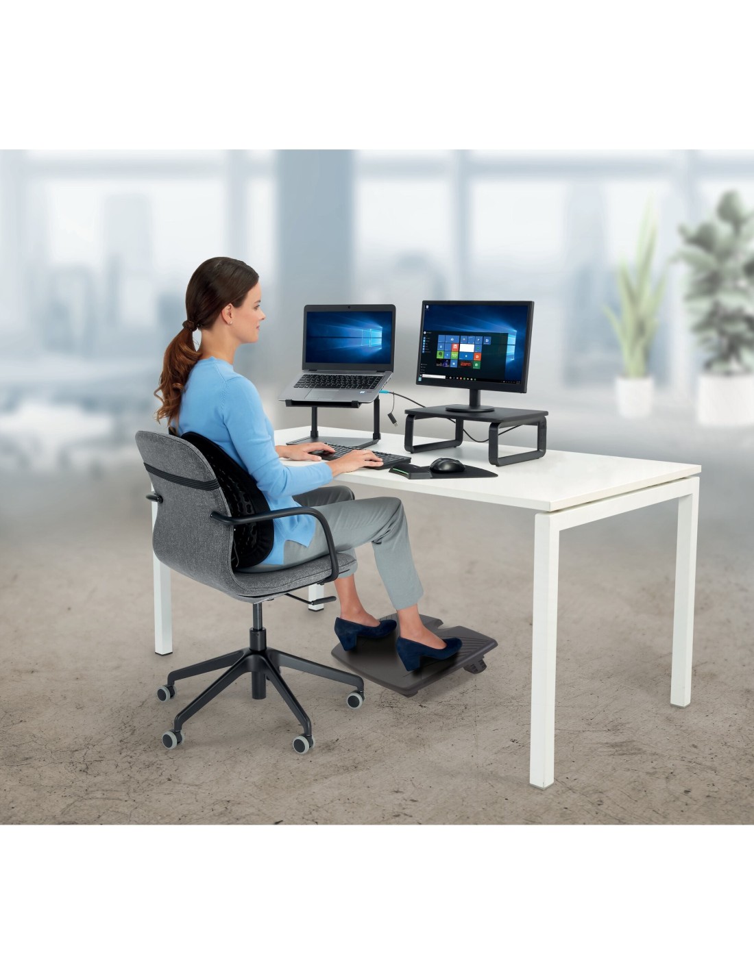 Más opciones para mejorar la comodidad personal. Mantenga las piernas elevadas y mejorará la postura y la circulación mientras trabaja. Los soportes de los reposapiés se cambian fácilmente para cambiar la altura (de 4,5´ a 6,5´) y la inclinación (de 10 a 25 grados). Elija hasta seis posturas distintas. No se necesitan herramientas. Su superficie y su base antideslizantes le mantienen seguro. Ayuda a reducir la presión sobre la zona lumbar cuando permanece sentado.