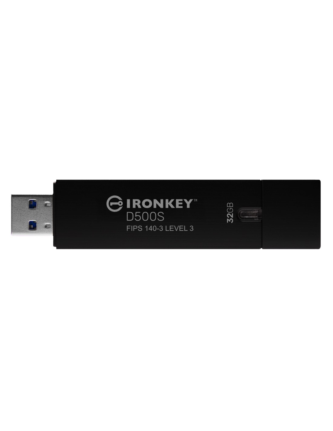 Kingston Technology IronKey 32GB D500S FIPS 140-3 Lvl 3 AES-256. Capacidad: 32 GB, Interfaz del dispositivo: USB tipo A, Versión USB: 3.2 Gen 1 (3.1 Gen 1), Velocidad de lectura: 260 MB/s, Velocidad de escritura: 190 MB/s. Factor de forma: Tapa. Protección mediante contraseña. Peso: 50 g. Color del producto: Negro