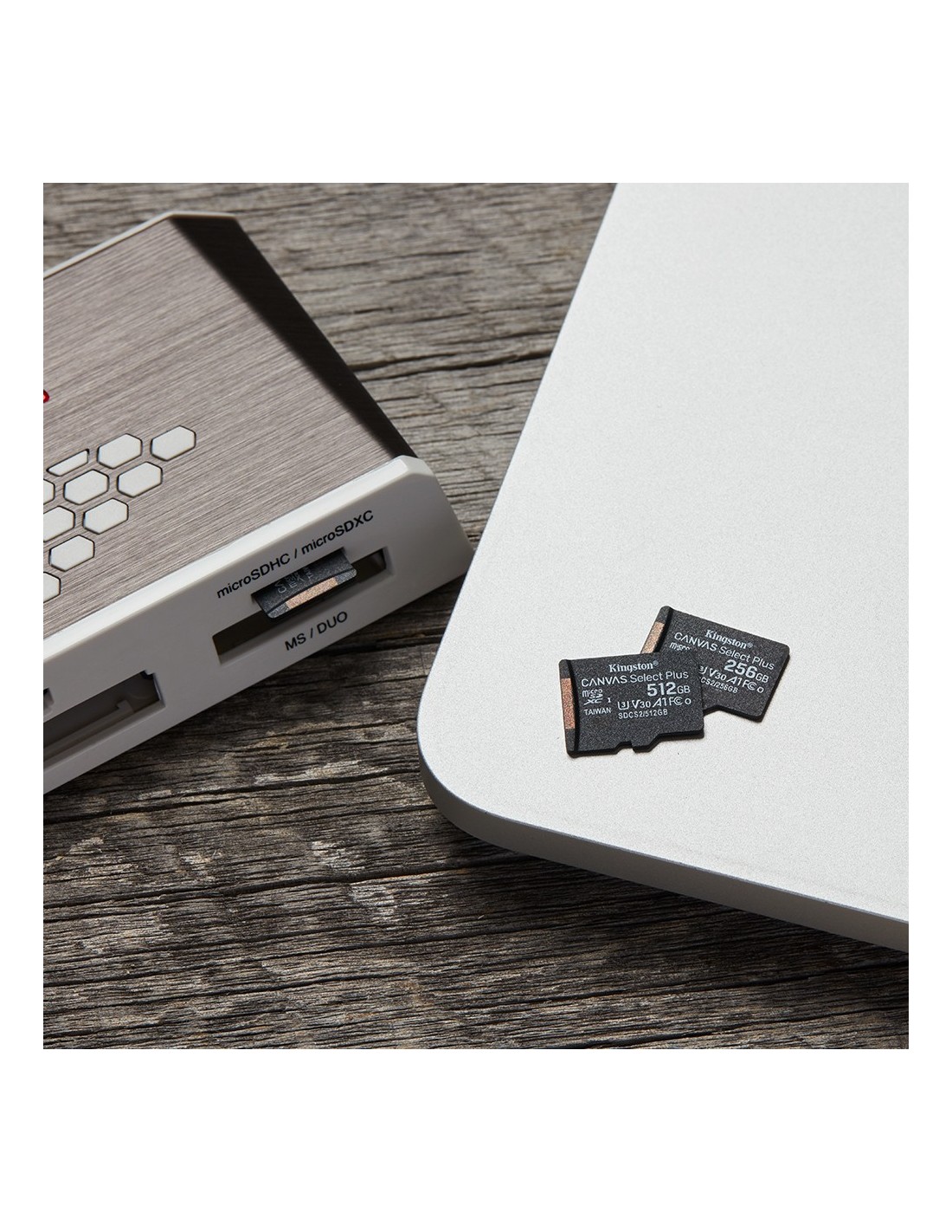 Kingston Technology Paquete de una tarjeta micSDXC Canvas Select Plus 100R A1 C10 de 256 GB sin ADP. Capacidad: 256 GB, Tipo de tarjeta flash: MicroSDXC, Clase de memoria flash: Clase 10, Tipo de memoria interna: UHS-I, Velocidad de lectura: 100 MB/s, Velocidad de escritura: 85 MB/s, Clase de velocidad UHS: Class 3 (U3), Clase de velocidad de vídeo: V30. Funciones de protección: Resistente a golpes, Resistente a las vibraciones, A prueba de rayos X, Color del producto: Negro