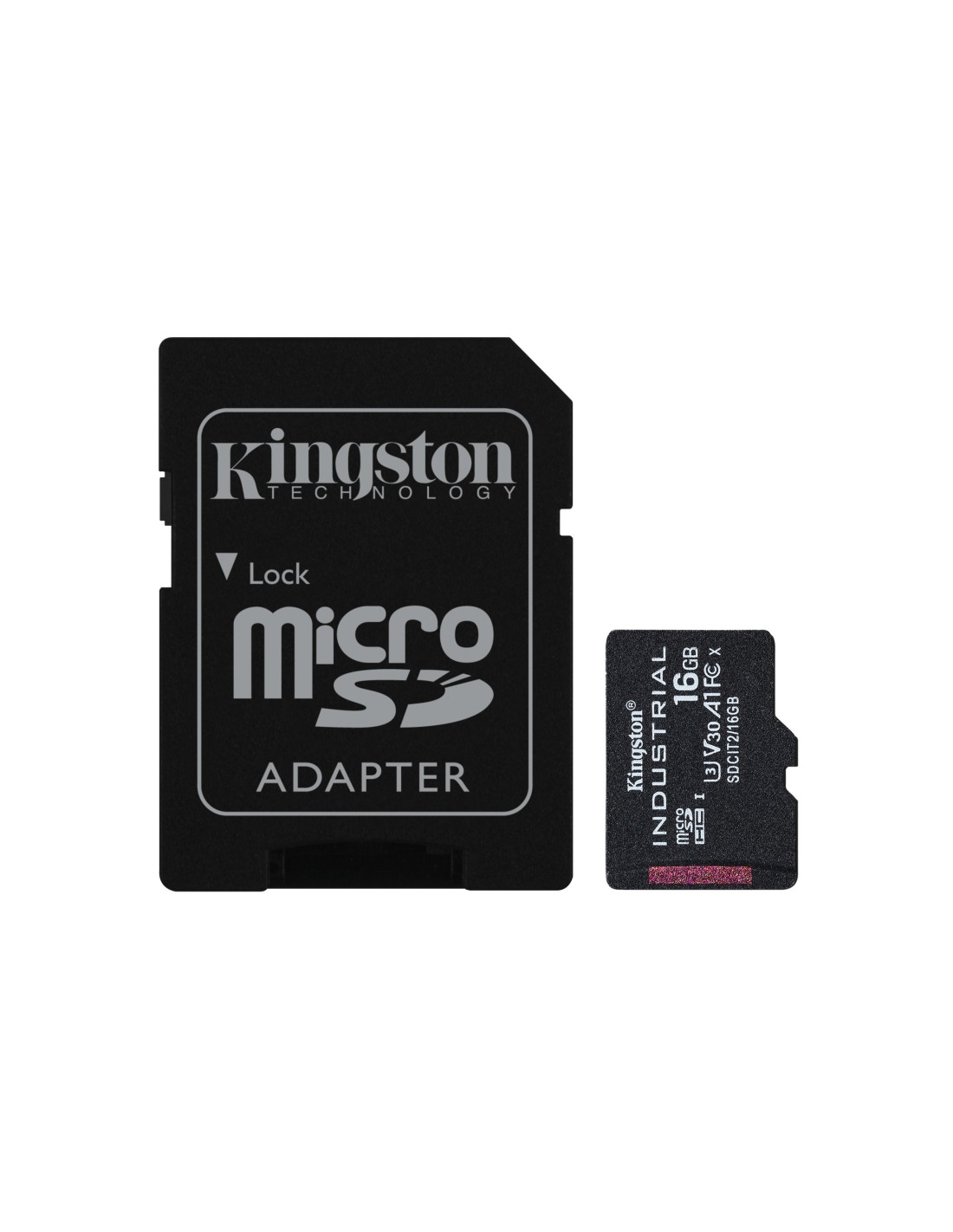Kingston Technology Tarjeta 16GB microSDHC Industrial C10 A1 pSLC + adaptador SD. Capacidad: 16 GB, Tipo de tarjeta flash: MicroSDHC, Clase de memoria flash: Clase 10, Tipo de memoria interna: UHS-I, Velocidad de lectura: 100 MB/s, Velocidad de escritura: 80 MB/s, Clase de velocidad UHS: Class 3 (U3), Clase de velocidad de vídeo: V30. Funciones de protección: Resistente a la temperatura, Resistente al agua, A prueba de rayos X, Color del producto: Negro