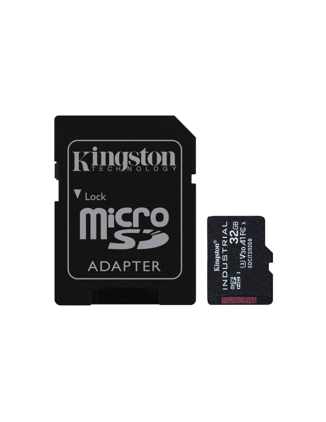 Kingston Technology Tarjeta 32GB microSDHC Industrial C10 A1 pSLC + adaptador SD. Capacidad: 32 GB, Tipo de tarjeta flash: MicroSDHC, Clase de memoria flash: Clase 10, Tipo de memoria interna: UHS-I, Velocidad de lectura: 100 MB/s, Velocidad de escritura: 80 MB/s, Clase de velocidad UHS: Class 3 (U3), Clase de velocidad de vídeo: V30. Funciones de protección: Resistente a la temperatura, Resistente al agua, A prueba de rayos X, Color del producto: Negro