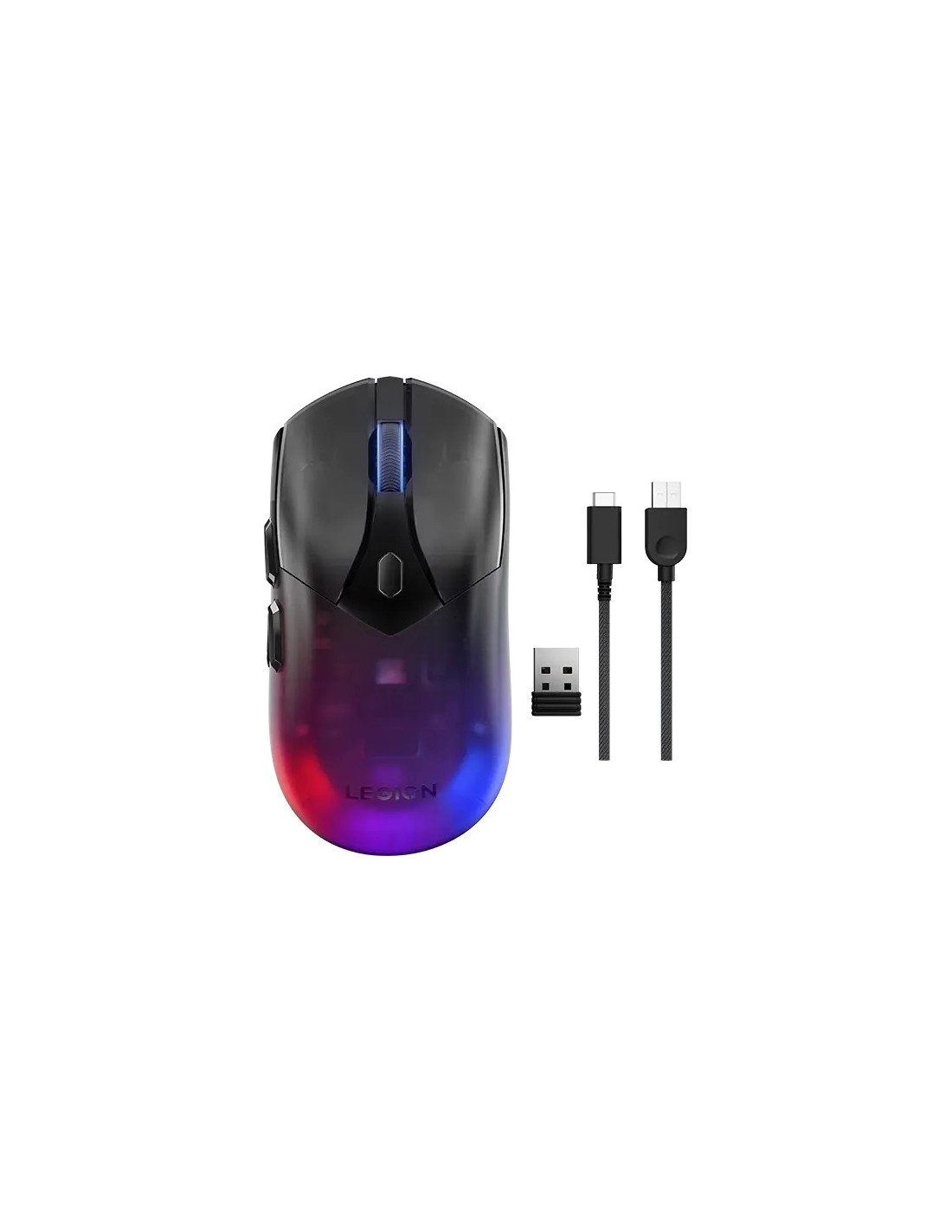 Lenovo Legion M410. Factor de forma: Ambidextro. Tecnología de detección de movimientos: Óptico, Interfaz del dispositivo: RF Wireless + USB Type-C, Resolución de movimiento: 16000 DPI, Tipo de botones: Botones presionados, Cantidad de botones: 6, Tipo de desplazamiento: Rueda, Aceleración (máx.): 40 G. Iluminación de color: Azul, Verde, Rojo. Fuente de energía: Baterías/Cable. Color del producto: Negro, Transparente